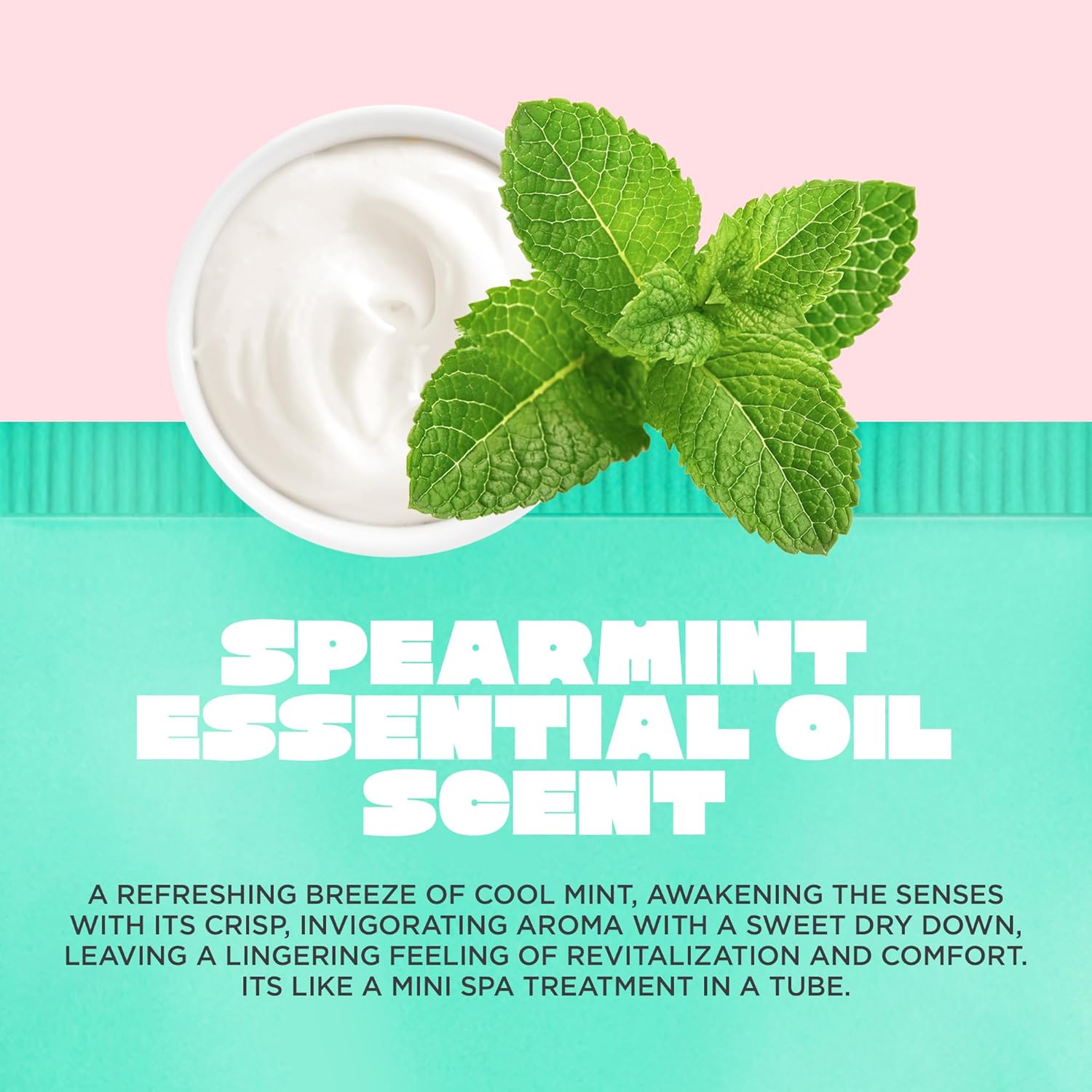 - SPEARMINT ESSENTIAL OIL: A refreshing breeze of cool mint, awakening the senses with its crisp, invigorating aroma with a sweet dry down, leaving a lingering feeling of revitalization and comfort. Its like a mini spa treatment in a tube.