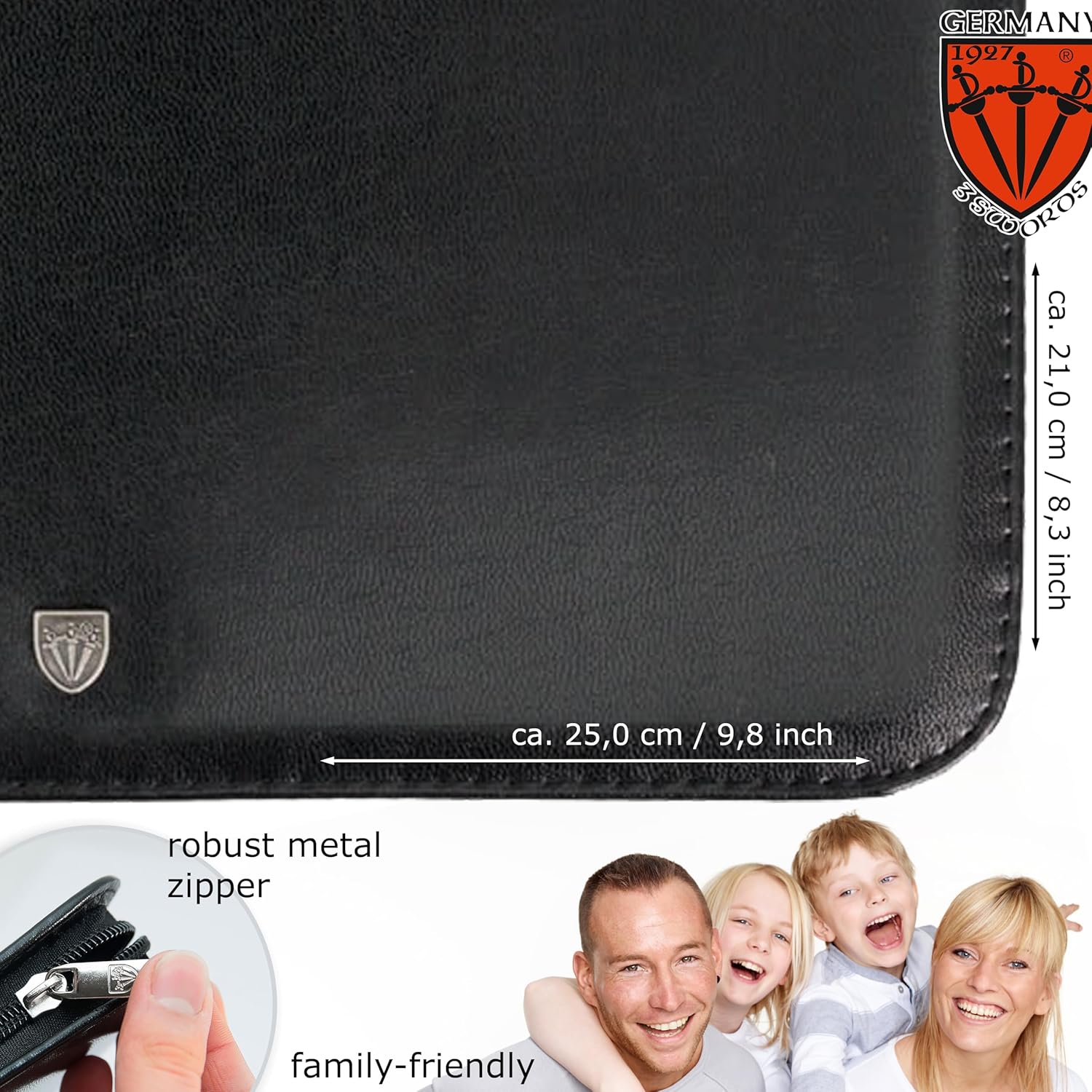 - CASE: Fashion leather black, size ca. 25,5 x 21,0 x 3,0 cm. Our organizers are made of high-grade fashion or classic materials. Additional equipment: Microfiber cleaning cloth for cleaning steel items, general info sheet âFinger - Nail Groomingâ.