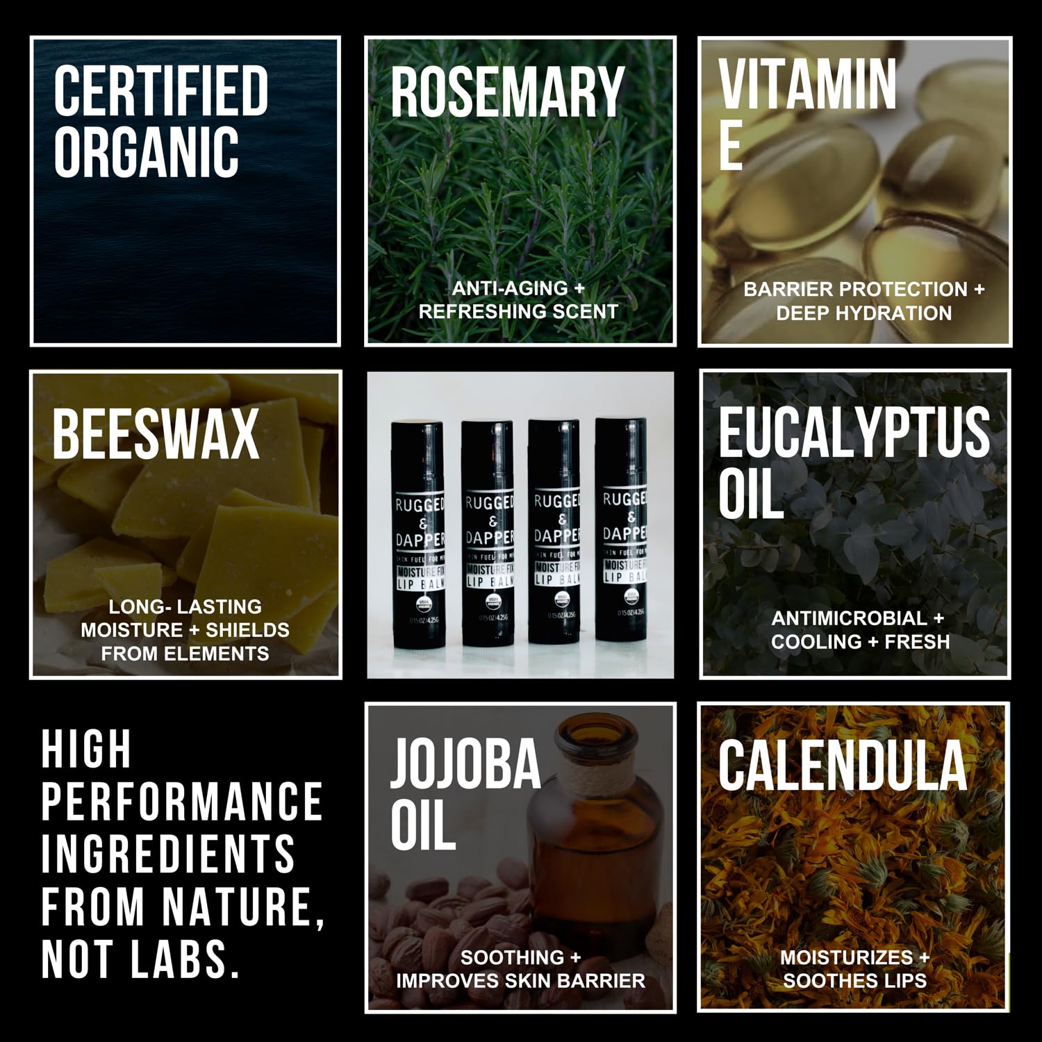 - đ´ CERTIFIED NATURAL + ORGANIC INGREDIENTS: Crafted in the USA with high-quality, natural ingredients like beeswax, jojoba oil, and invigorating eucalyptus. Free from harmful chemicals, this refreshing lip balm for men nourishes and softens for healthy, kissable lips.