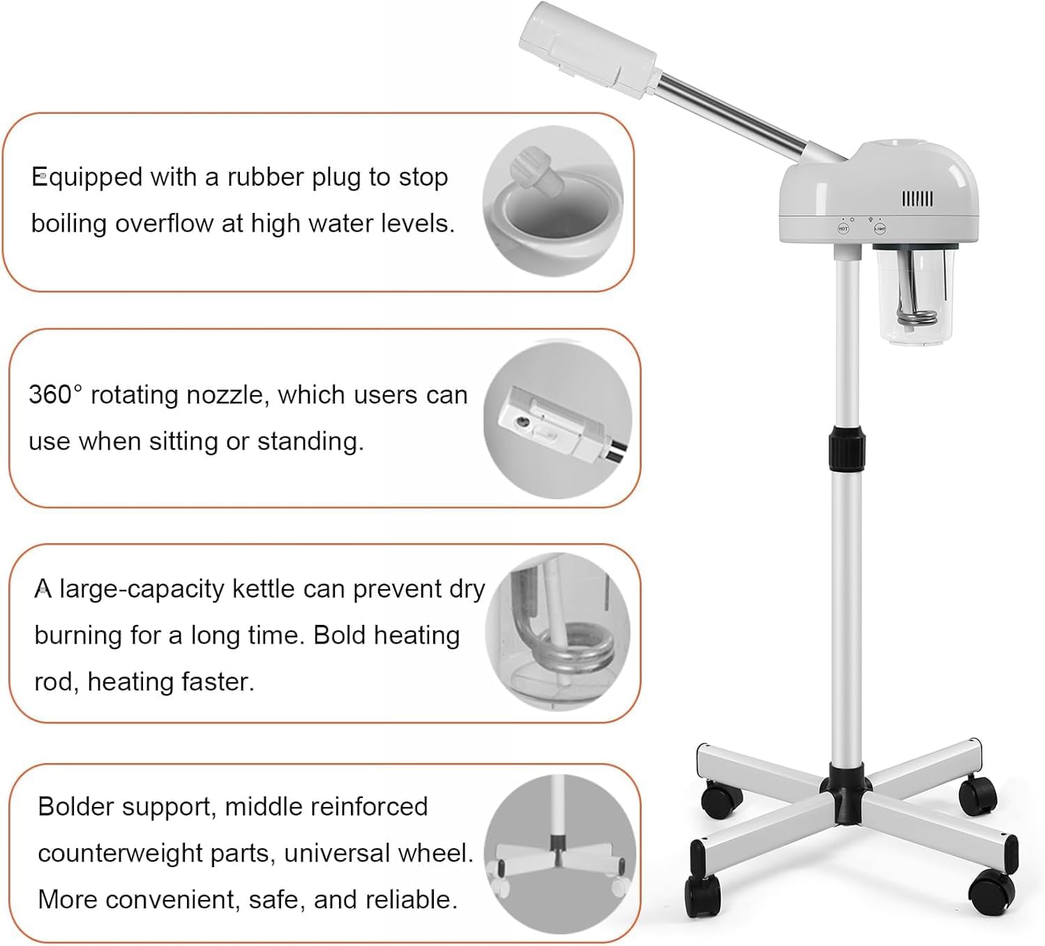 Professional Facial Steamer with Hot Mist Function, Stand Facial Steamer On Wheels, Height Adjustable & 360° Rotatable Nozzle, Use at Home & Salon SPA