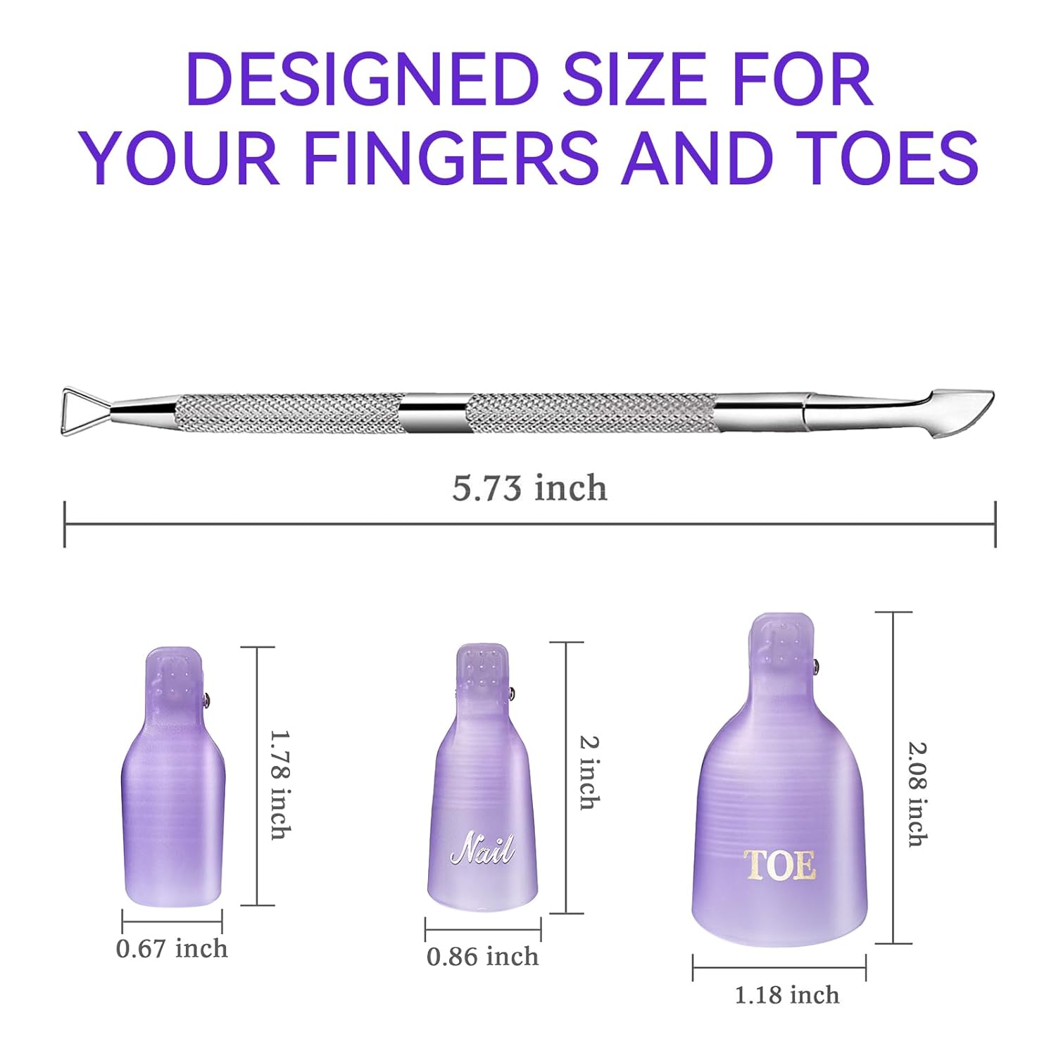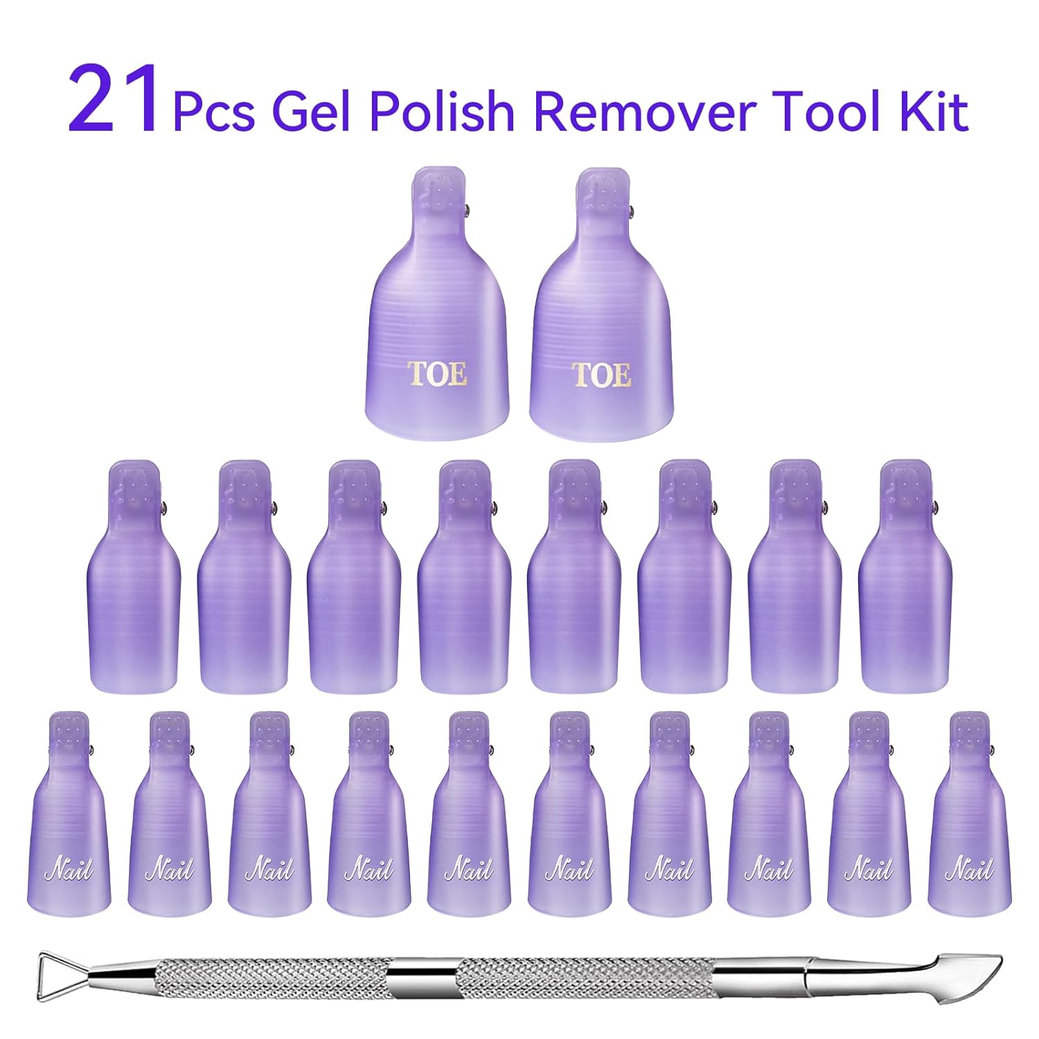 - 【All-in-One Nail Gel Remover Kit】This complete kit includes 10 soak-off clips for fingers, 10 for toes, and 1 double-ended nail pusher—everything you need for quick and efficient gel polish removal at home or in professional salons.