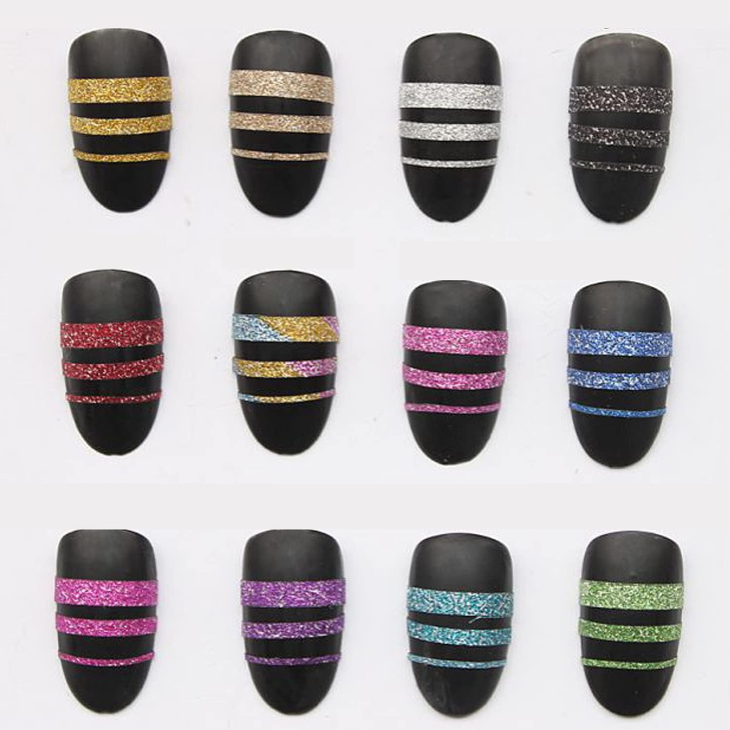 - ăColoră36 pcs Nail Art Striping Tape Line Sets,these nail foils tape are similarities but have a little different with color of size.Come with glitter matte silver,golden,green,blue,red,purple etc chrome nail powder color nail art striping tape. nail gold tape.These nail art line tape stickers can be used to design your nail tumblers art,nail patterns,nail manicure tumbler etc.Aslo can be used with UV Gel,striping tape for nail art silver,etc.