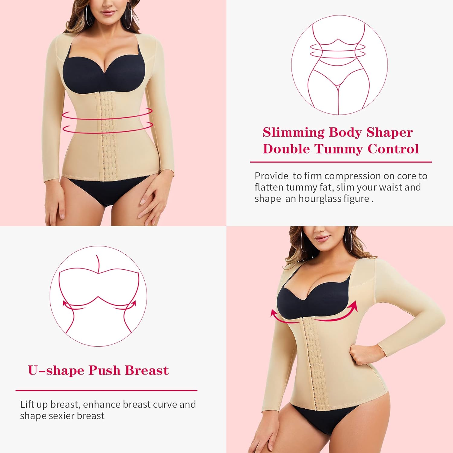 - HIGHLIGHTS THE CONTOURS OF THE BODY : this waist trainer bodysuit's middle part is 2-layer stretchy material,provide super high compression on tummy,hold stomach in,help reduce waistline and support back, front 4 hooks allow you to adjust the tightness you want, and U-shape push up breast design makes your chest more attractive, give you a beautiful hourglass figure.