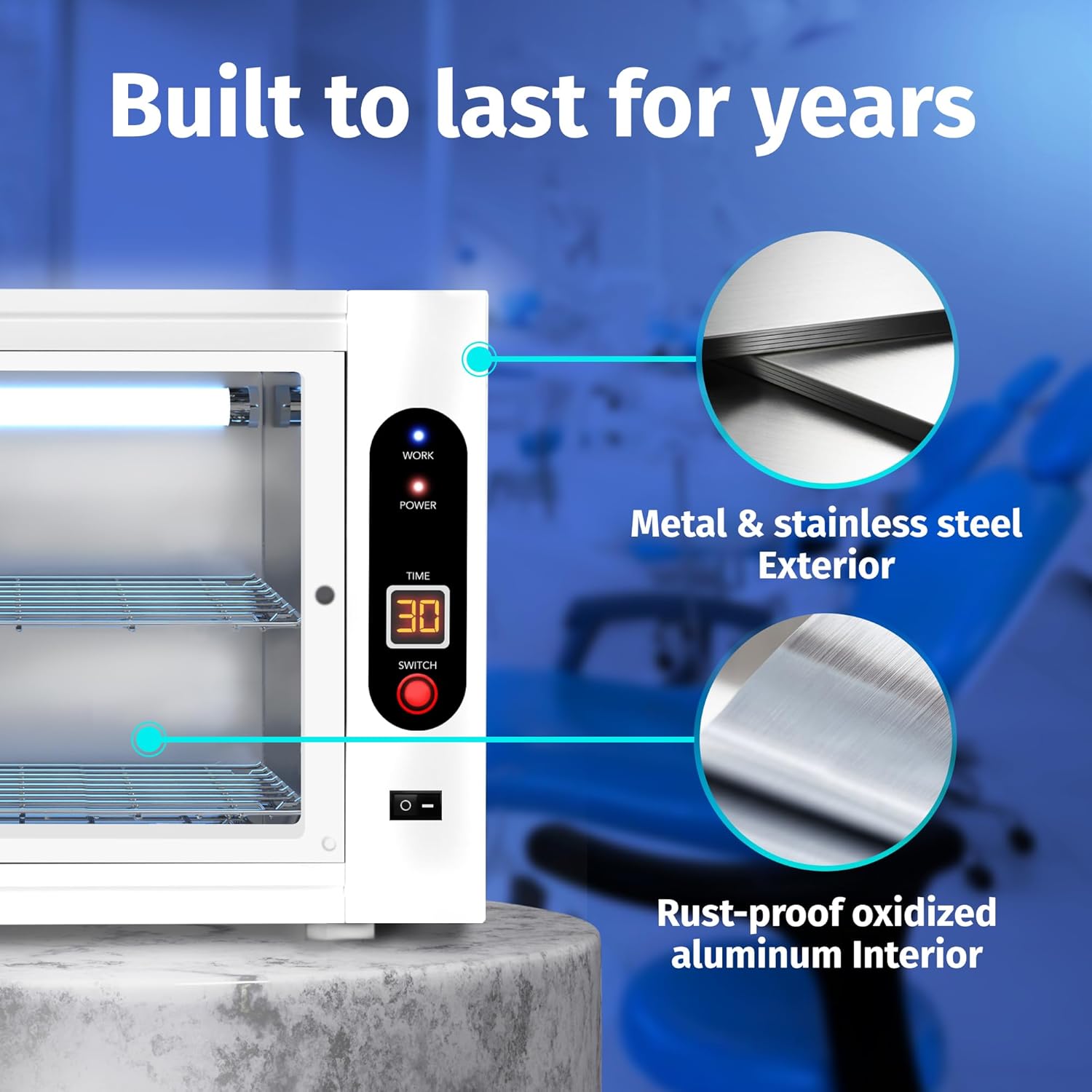 - LED TIMER DISPLAY - The UV Sterilizer has a sturdy glass door, a metal shelf, and an inner cabinet made of stainless steel with a brilliant led light. In order to keep dangerous rays within and prevent unintentional exposure, the sterilizer cabinet has an insulated door and an auto shut-off system. The ultraviolet light goes out when the door is opened, and it comes back on when the door is shut.