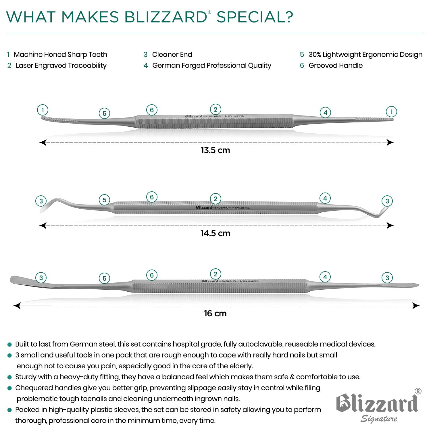 Ingrown Toenail File Set by Blizzard – 3 Piece Double-Ended Tool Kit with Blacks File, Nail Cleaner and Lifter for Cleaning and Care of Ingrown Toenails - Premium Stainless Steel