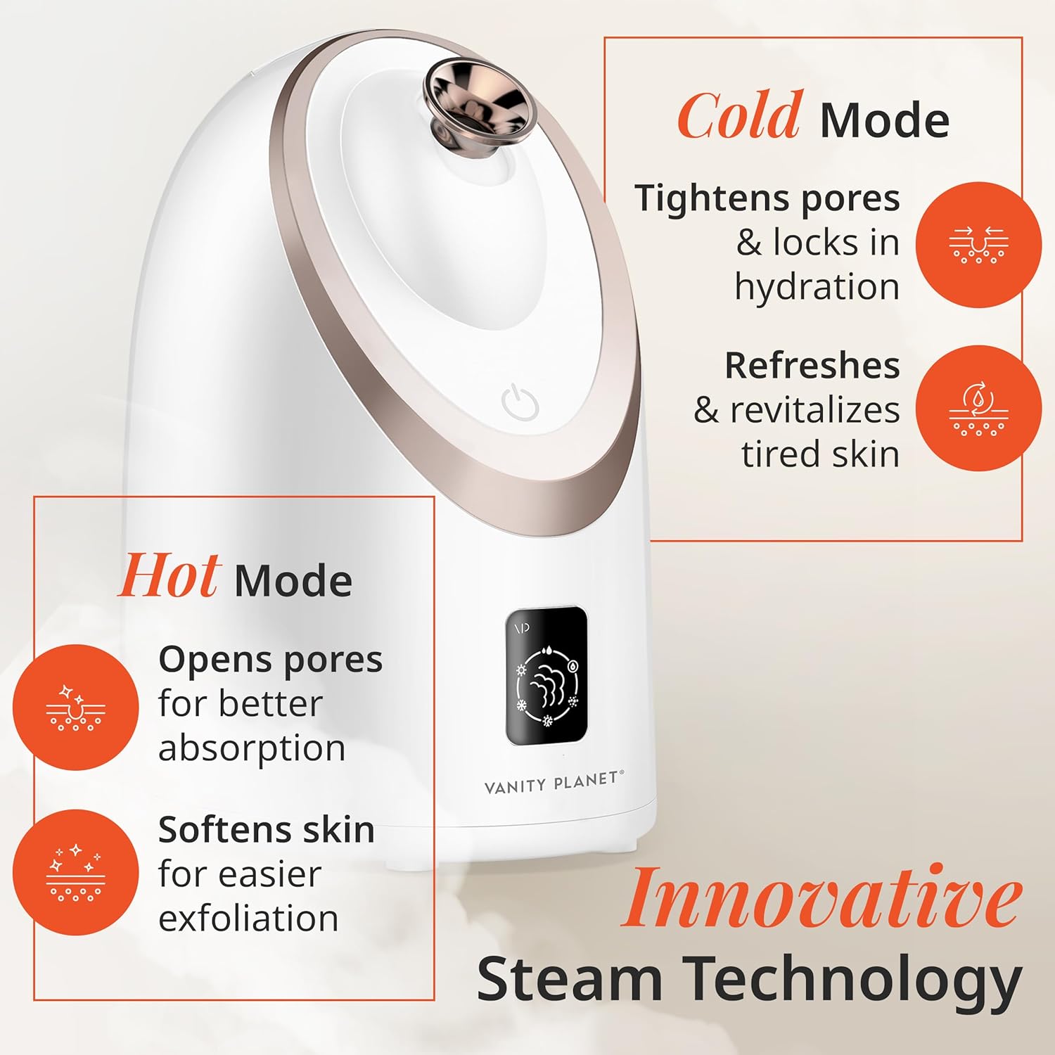 - A SPA-RETREAT FOR YOUR COMPLEXION: Soak your skin in a blissful oasis of aromatic steam! Vanity Planet Senia Hot and Cold Smart Facial Steamer combines a luxurious cleansing treatment with a euphoric sensory experience using warm and cool Smart Steam Technology. Six customizable beauty modes purify the skin for an indulgent at-home spa treatment. Includes an essential oil basket, large water tank, and digital display. Cruelty free and innovated in California.