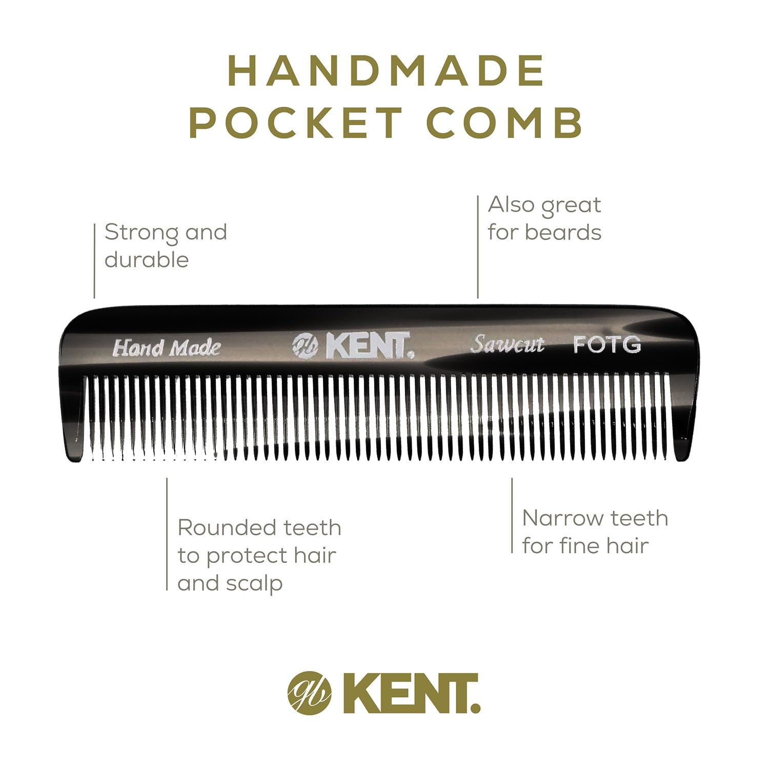 Kent FOT Black Graphite Fine Tooth Comb for Men - Handmade Pocket Comb for Travel, Styling, Fine or Thinning Hair, Mustache and Beard Care Handpolished Saw-Cut Made in England