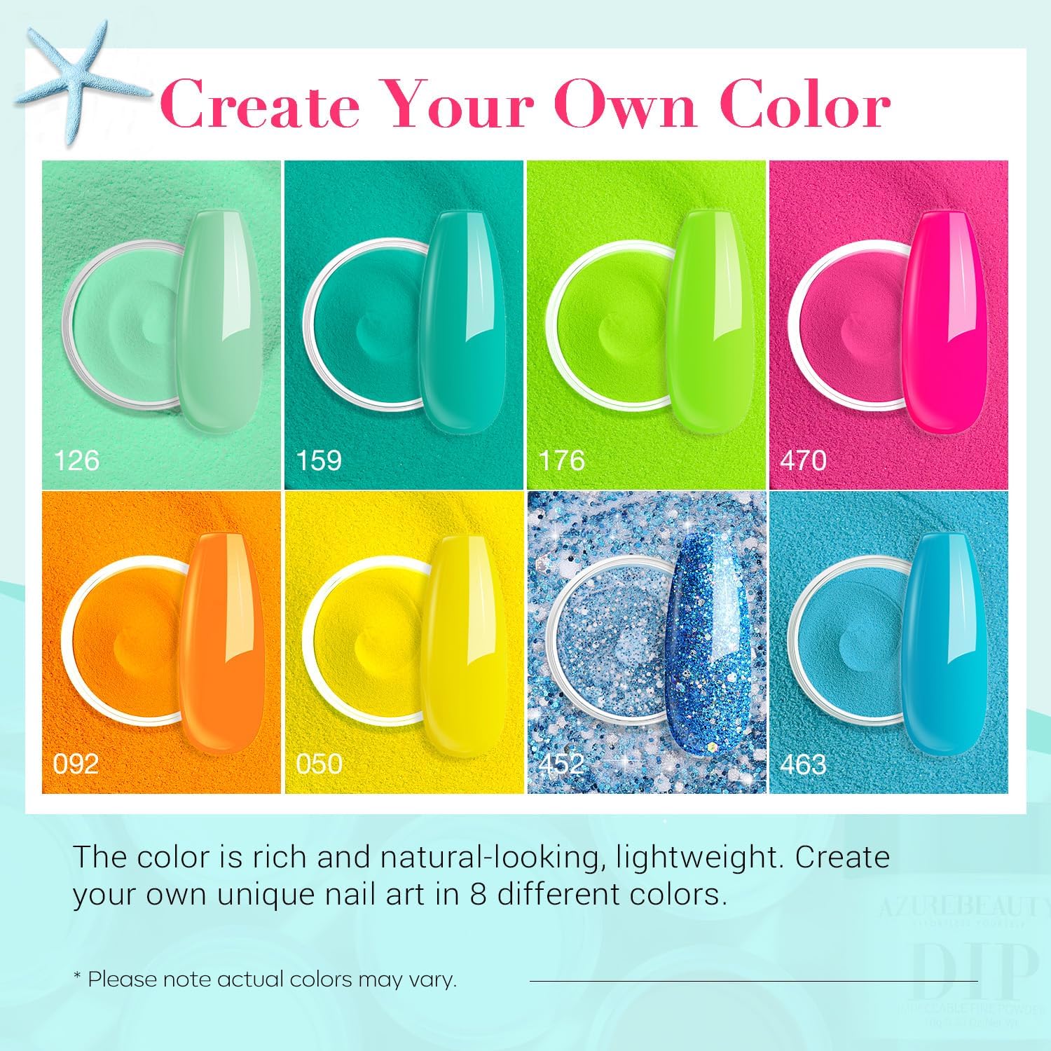 - đăLong Lasting Vibrant ShadesăAZUREBEAUTY nail dip powder kit starter set is long-lasting and anti-chipping, anti-peel off. The color is full and natural-looking, light, and has an impeccable shine finish. It can keep the nail art gorgeous and shiny for more than about 28 days with proper application.
