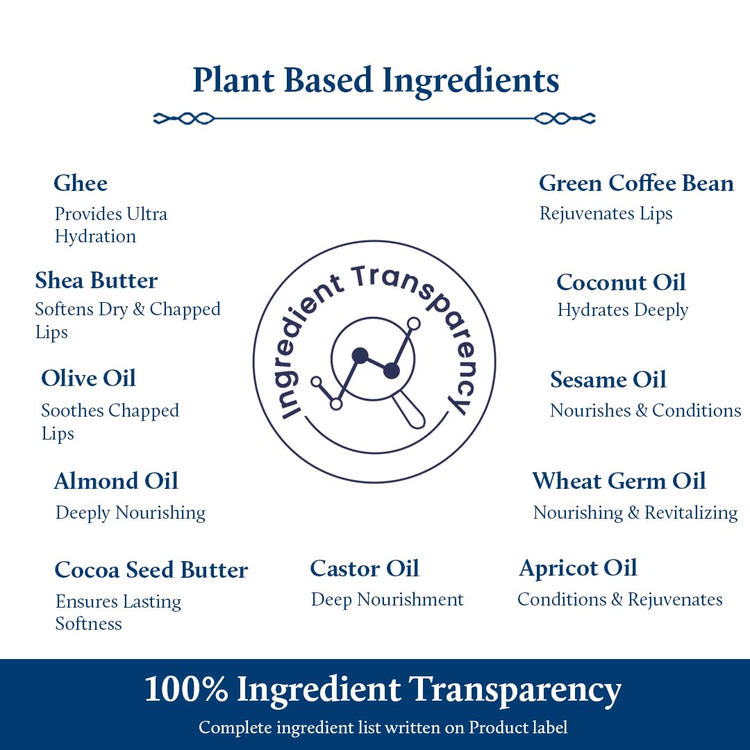 - DEEP HYDRATION for CHAPPED LIPS: Skin of the lip is thinner than the facial skin and tends to lose moisture quickly. The lip balm with Ghee and other natural oils like Coconut, Sesame, Castor and Almond Oil not only provide moisturization but also helps to seal and retain it. This fights dryness, chapped lips and gives Lip a healthy, supply, gloss and pout ready appearance