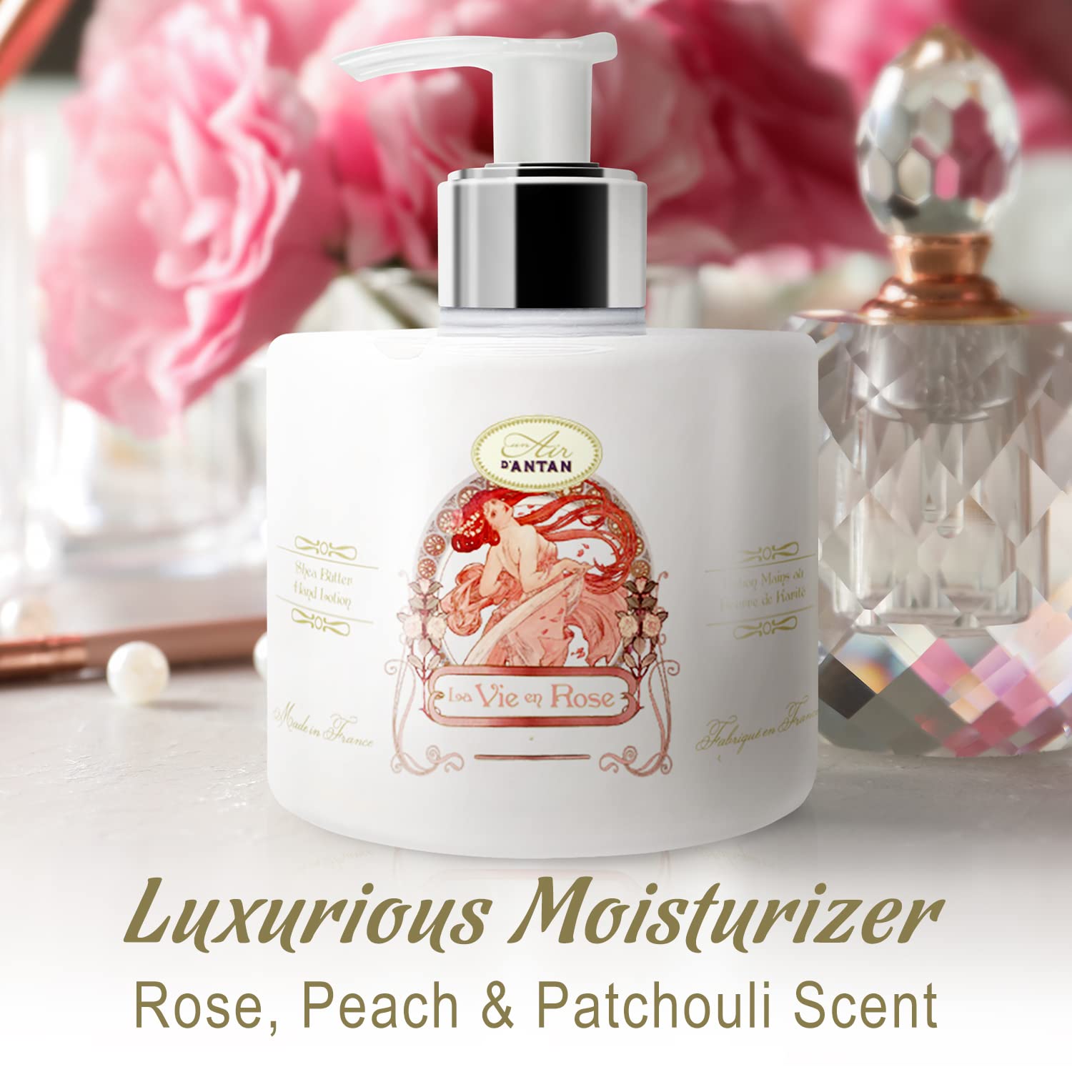 Un Air d'Antan Hand Cream for Dry Cracked Hands 10.5oz - Hand Lotion Pump, Non Greasy Moisturizer with Essential Oils, Cruelty Free Formula - Rose Peach Patchouli