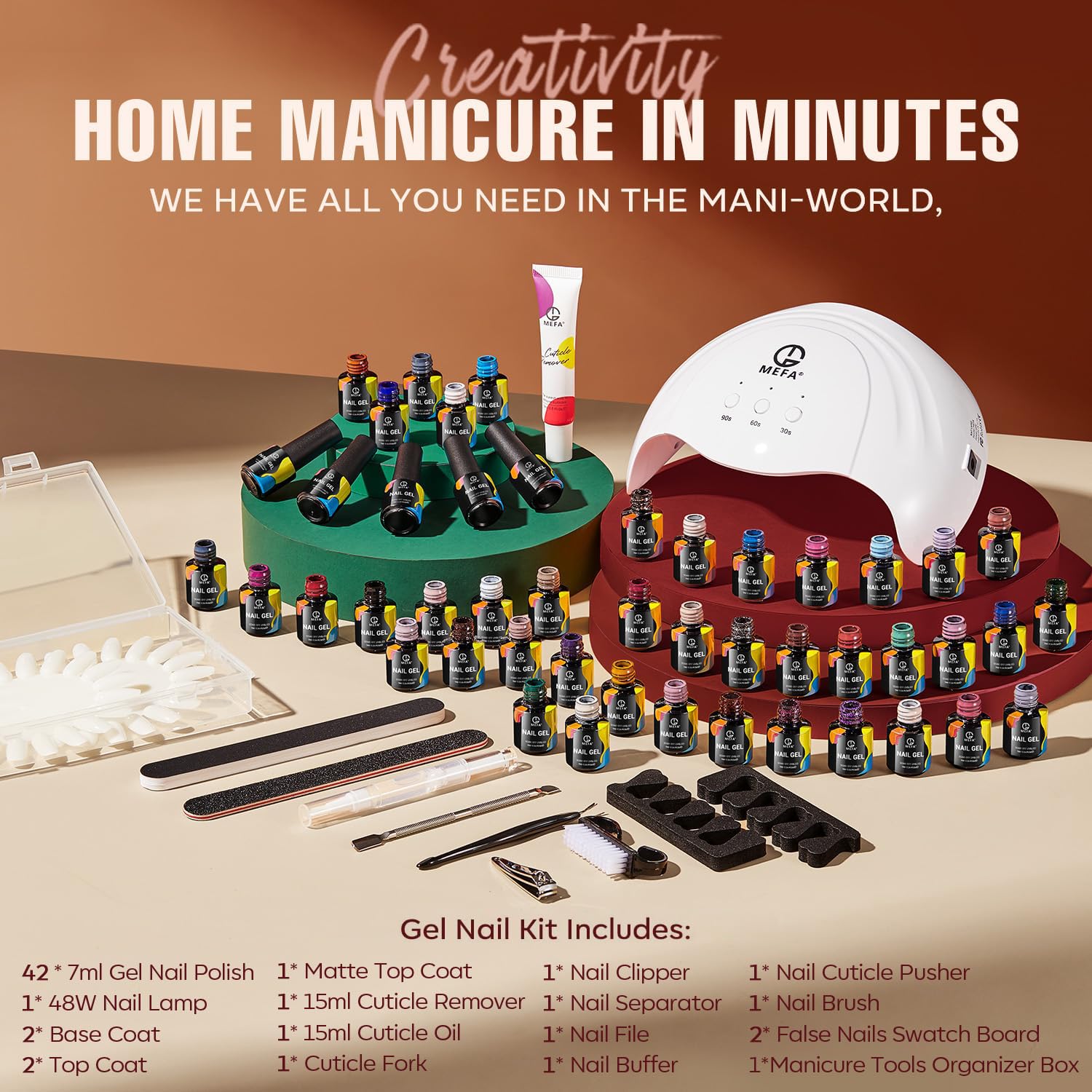 - 【DIY Salon Manicure at Home】This 42 colors gel nail polish kit covers a wide spectrum of shades suitable for any occasion throughout the year, designed with both nail beginners and experts in mind. MEFA gel polish kit includes a repertoire of nail care essentials, ensures a smoother and more nourishing nail care routine, enhance nail strength and durability.