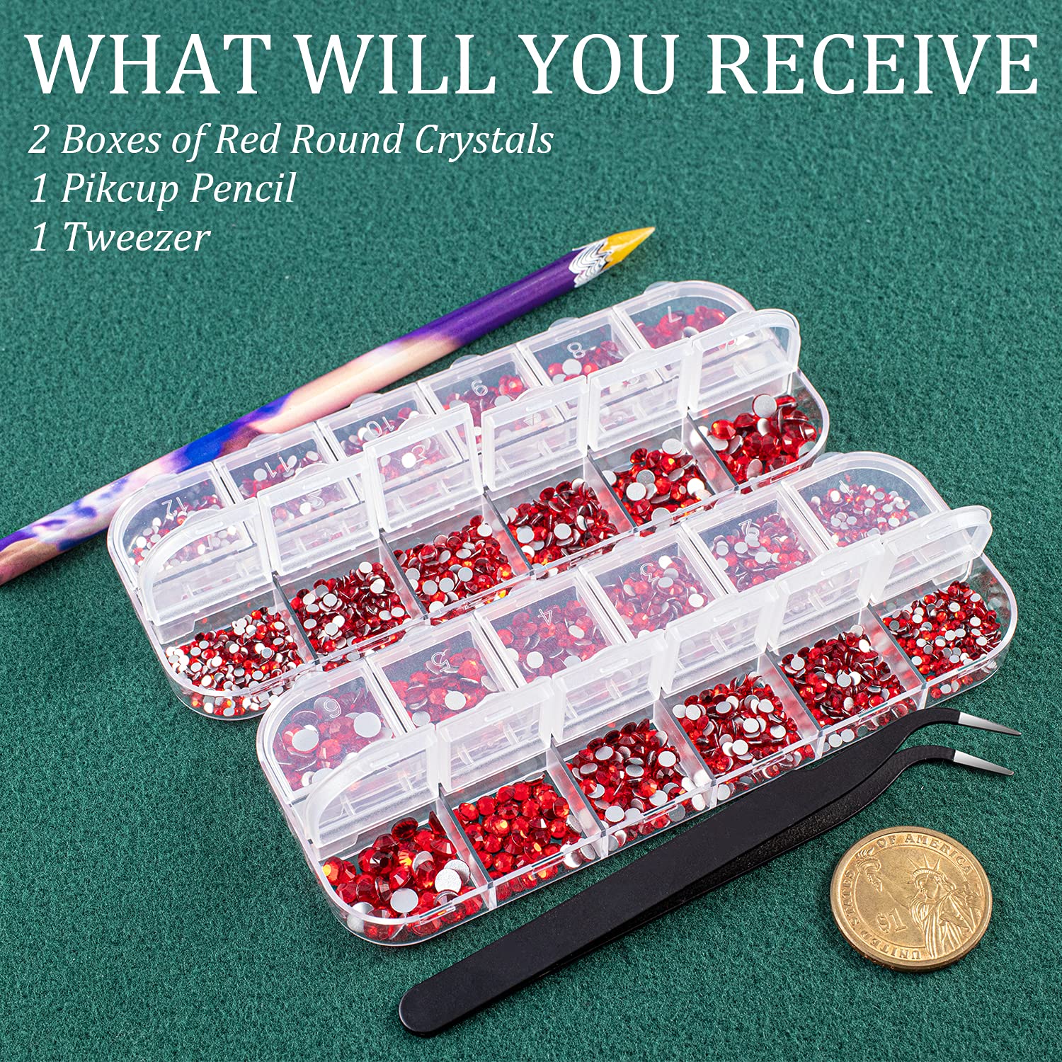- ❤WHAT YOU WILL RECEIVE -- 2 Boxes of 6 Sizes Red Round Glass Nail Crystal Rhinestones Beads (Totally About 1720 PCS); 1 PCS Rhinestone Picker Pencil; 1 PCS Tweezer. The Well Equipped Rhinestone Set Is Suitable for Both Professional Nail Technician and Inexperienced Starter for Nail Art.