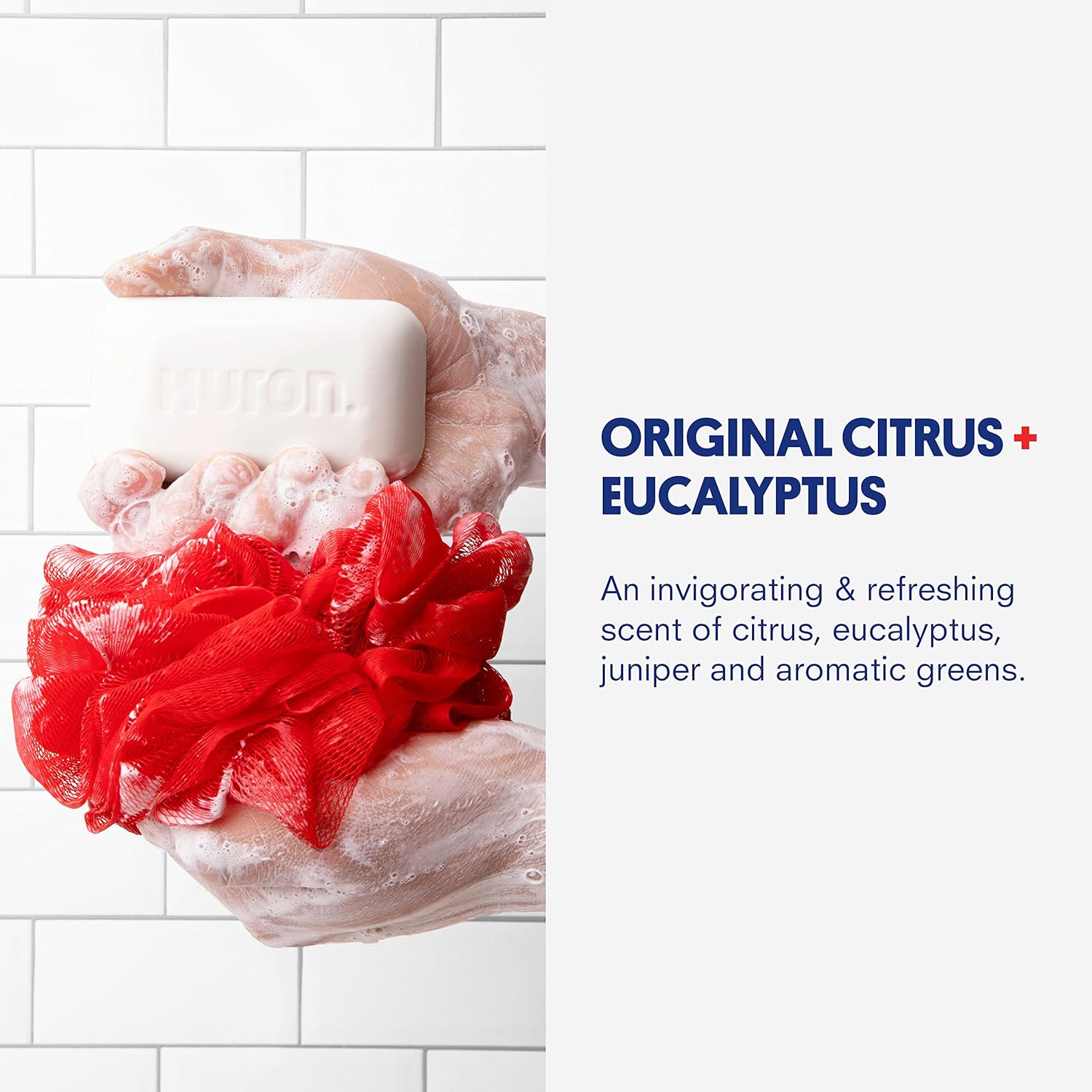 Huron Bar Soap - Citrus + Eucalyptus, 3 Pack - Triple-Milled for Long-Lasting Use - Moisturizing with Shea Butter & Coconut Oil - Crisp Scent of Citrus, Eucalyptus, Mint & Greens