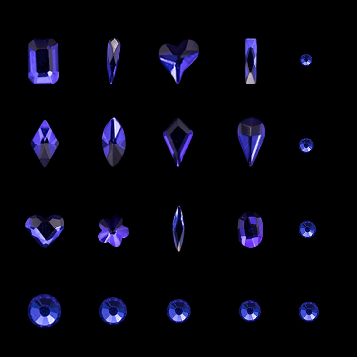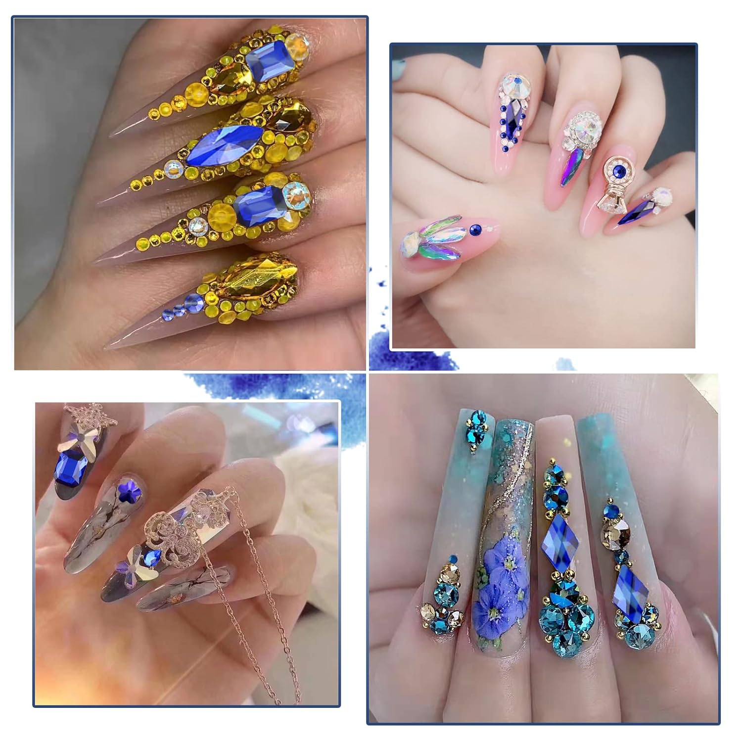 - đăBlue Rhinestones for NailsăïŒThe nail crystal kit includes 2500 round flat rhinestones of 8 kinds and 600 blue special-shaped diamonds of 12 kinds in a transparent storage box, 1pcs nail rhinestones pen and 1pcs tweezers. Our 3D nail art rhinestones are available in different popular styles, which will add brilliance and charm to your craftsmanship and make your nails more dazzling and charming.