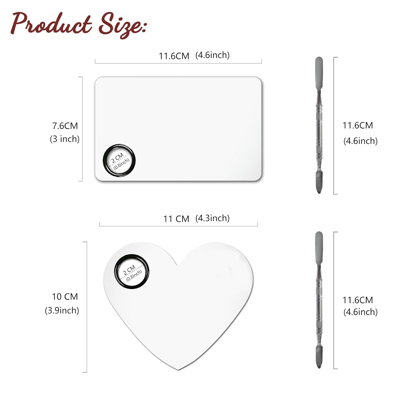 - 2.ăPackage Contentsă: 2Pcs Makeup Palettes & 2Pcs Spatulas. 1rectangular palette (length x width: 4.6*3in) + 1 heart-shaped makeup palette (length x width: 4.3*3.9in) +2 spatulas (length: 4.6in), Small and light.