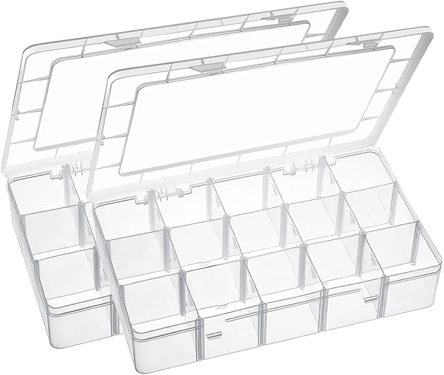 15 Large Grids Plastic Organizer Box with Dividers, 2 Pack Clear Compartment Container Storage for Washi Tapes Beads Crafts Jewelry Fishing Tackles, Size 11 x 6.3 x 2.2 in