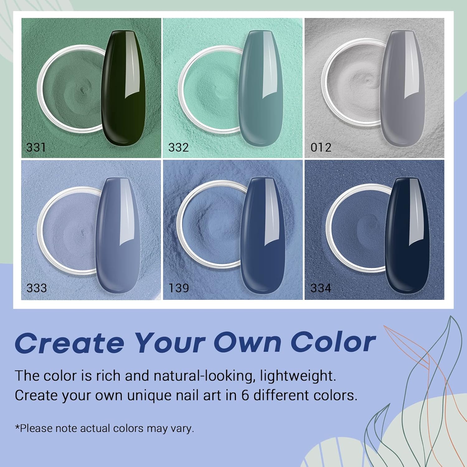 - Dusty Green Blue Dip Powder Set: With this premium dip powder set covering 6 different tones(slate&indigo&cornflower blue, turquoise&army green, gray, 10g/box), your nails would look brilliant shine finish, lightweight, and more attractive. The set will meet your needs on all occasions(daily routine life, party, travel, etc) all year round