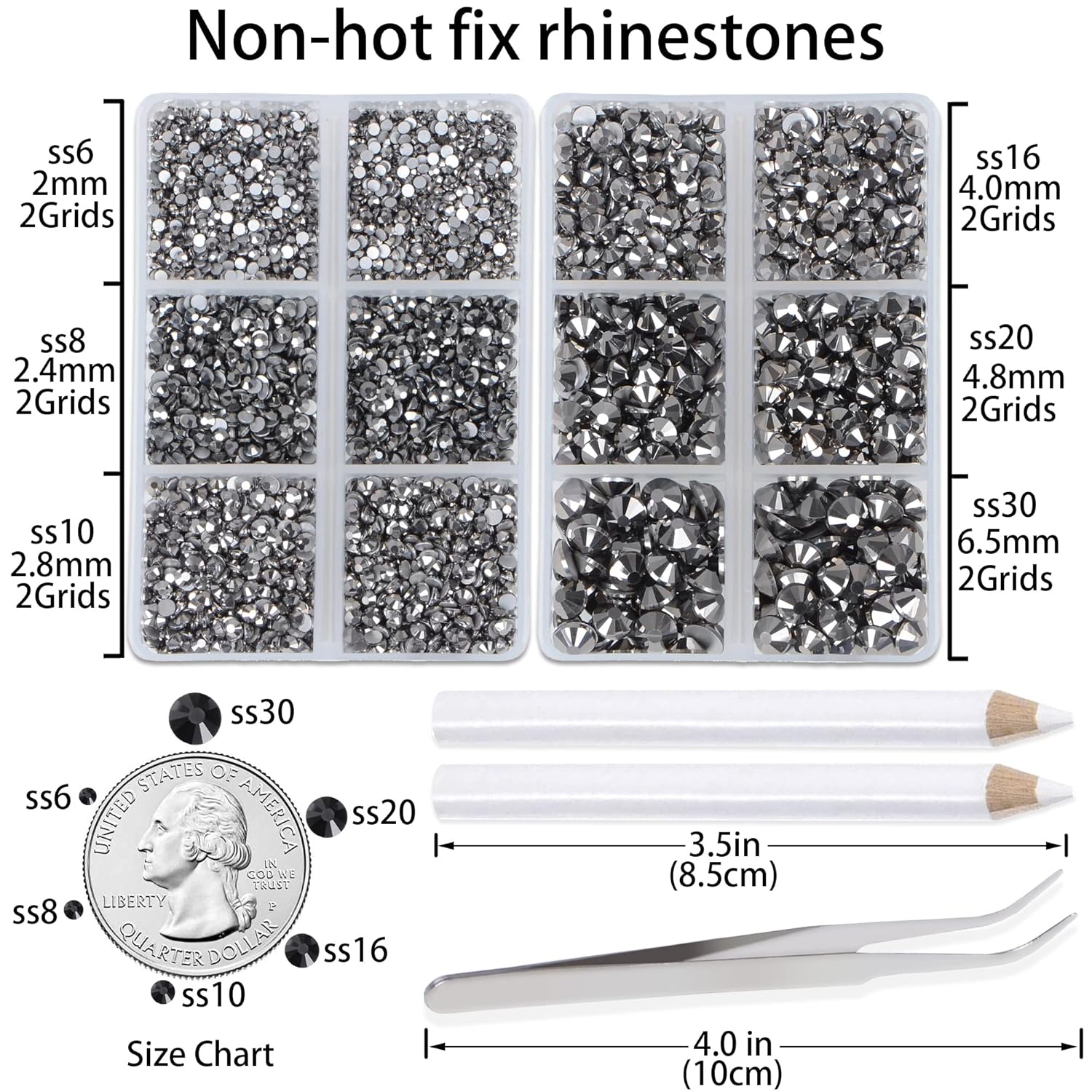 LPBeads 6000 Pieces Jet Hematite Non Hotfix Rhinestones 6 Sizes Round Crystal Glass Flat Back Rhinestones with Tweezers and Picking Pen for Nail Art Crafts Clothes Bags DIY