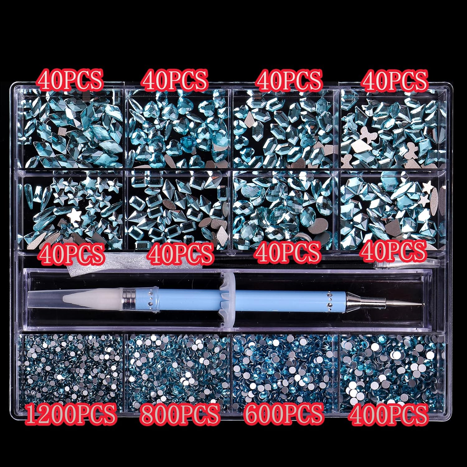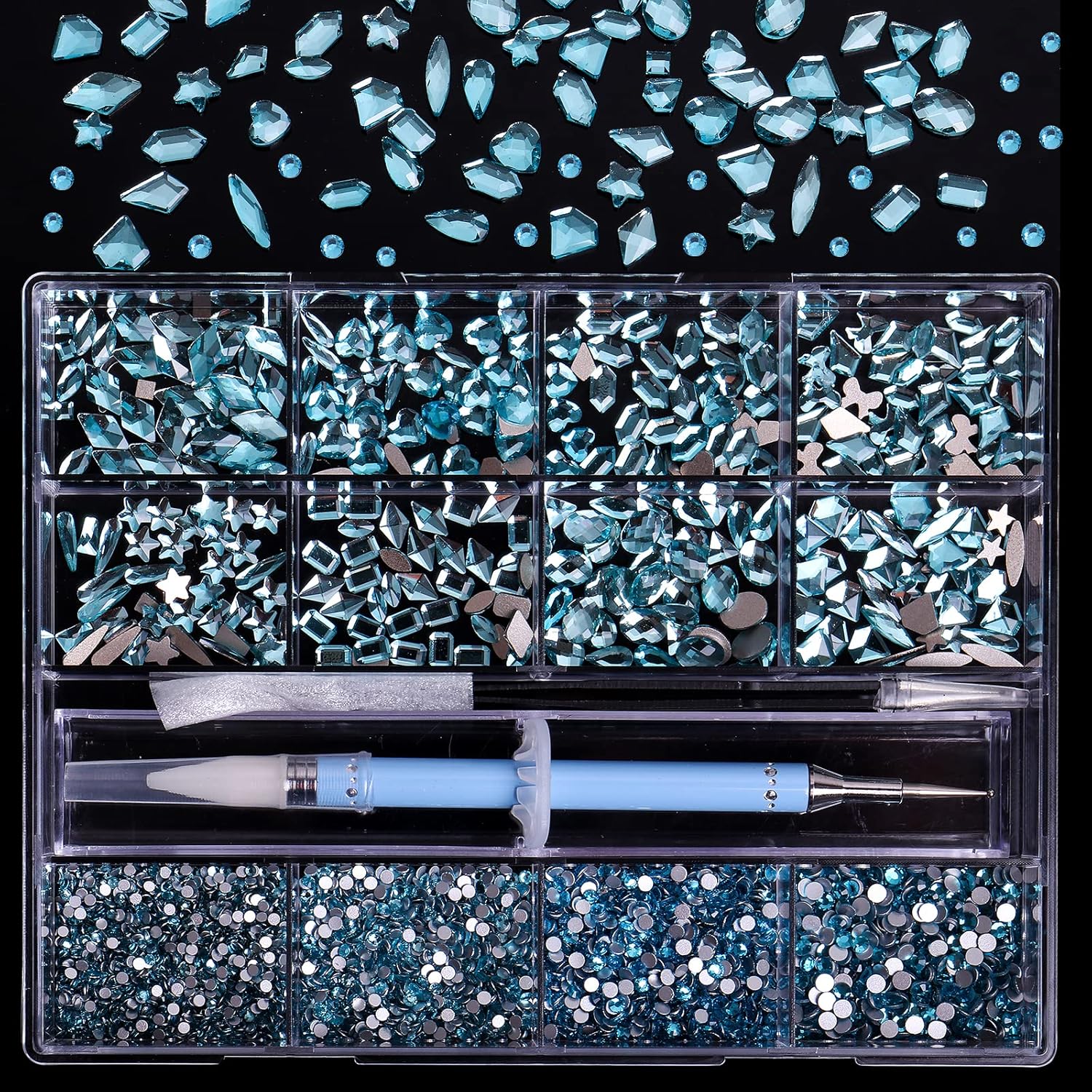 3320Pcs Lake Blue Nail Art Rhinestones Crystal,3D Rhinestones Gems Jewels Diamond,24 Types of 320 Diamonds + 3000 Round Beads, Crystals 3D Flat Back Gemstones for Nail DIY Crafts with Tweezers Pen