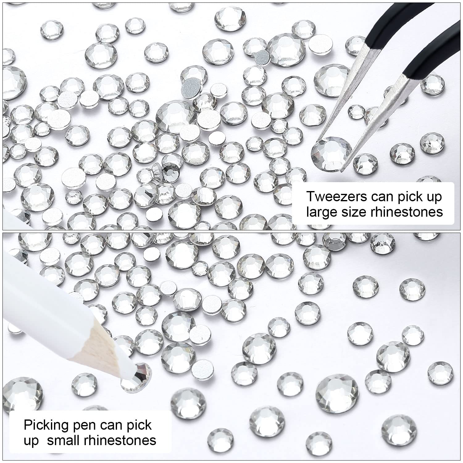 - 💎Use tweezers and Picking Pen gem picker to pick rhinestones, There is no glue on the bottom, additional nail gel is required, or other professional glue for makeup or nails. Can use E6000 super glue to fix on crafts, art decoration. not hotfix.