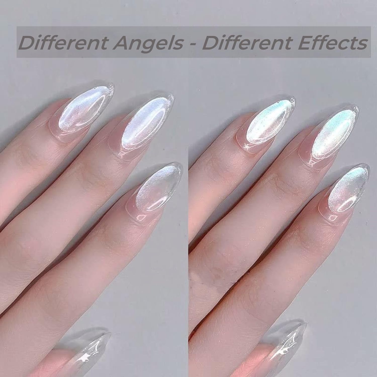 - Low Light Effect: The use of nail chrome powder with different colors of nail polish topcoat will present different rainbow pearl gradient effects, and the dazzling effect will be more obvious in sunlight.