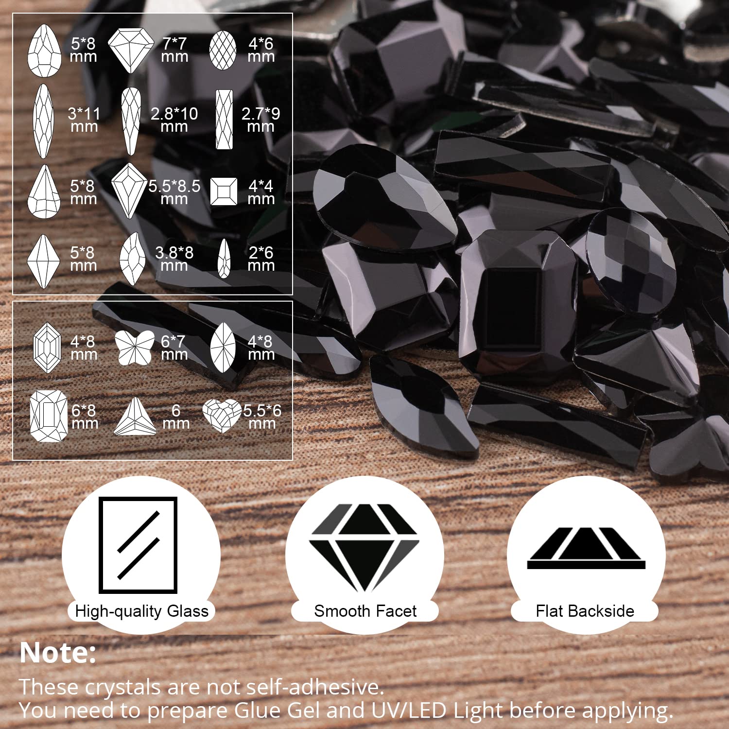 - WHAT YOU WILL RECEIVE -- The package includes 1 box of 12 styles of multi-shaped Black gems, 1 box of mixed round and 6-style multi-shaped Black stones, 1 pickup pencil and 1 tweezer.