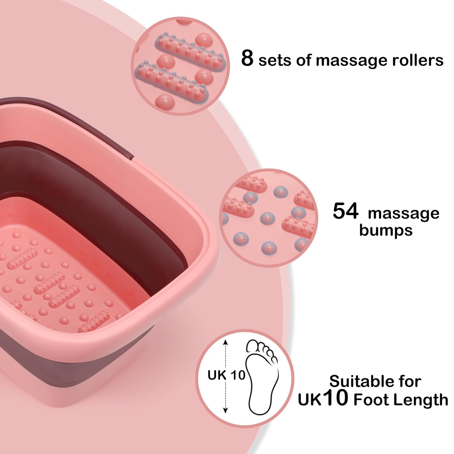 - Foot Spa with Massage Acupoints:There are 8 sets of massage rollers and 54 massage bumps from the collapsible basin bottom ,The feet soaking tub can scrub your feet and remove foot callus. Pouring warm water to the foot basin , It improve feet circulation, relieve pain, bringing one into relaxation, promotes all-round better health and well-being