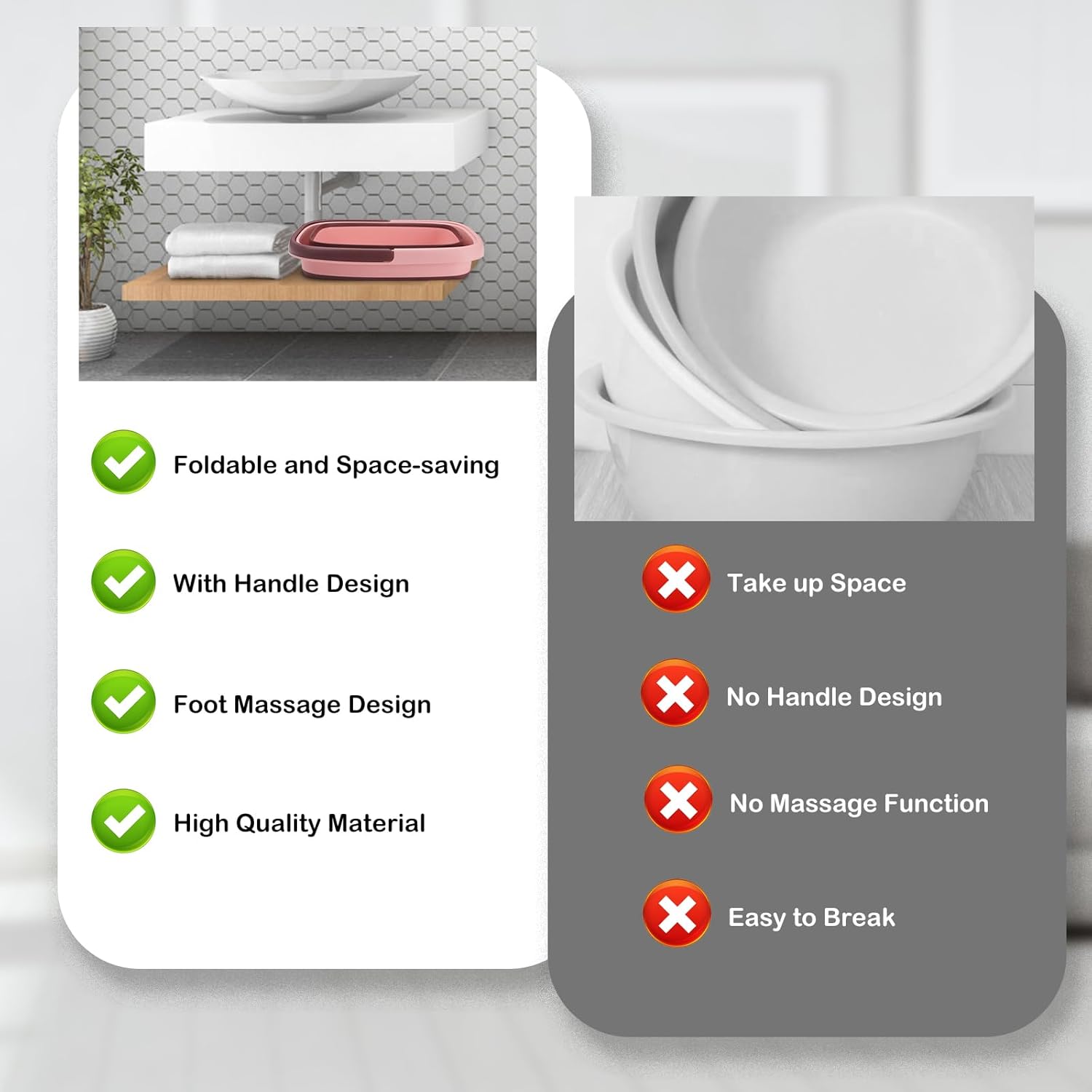 - Easy to Clean & Portable:This collapsible tub is light weight, sturdy, easy to clean and dries quickly after use. This Foot spa bath basin attached a carry handle that makes it easy to move.