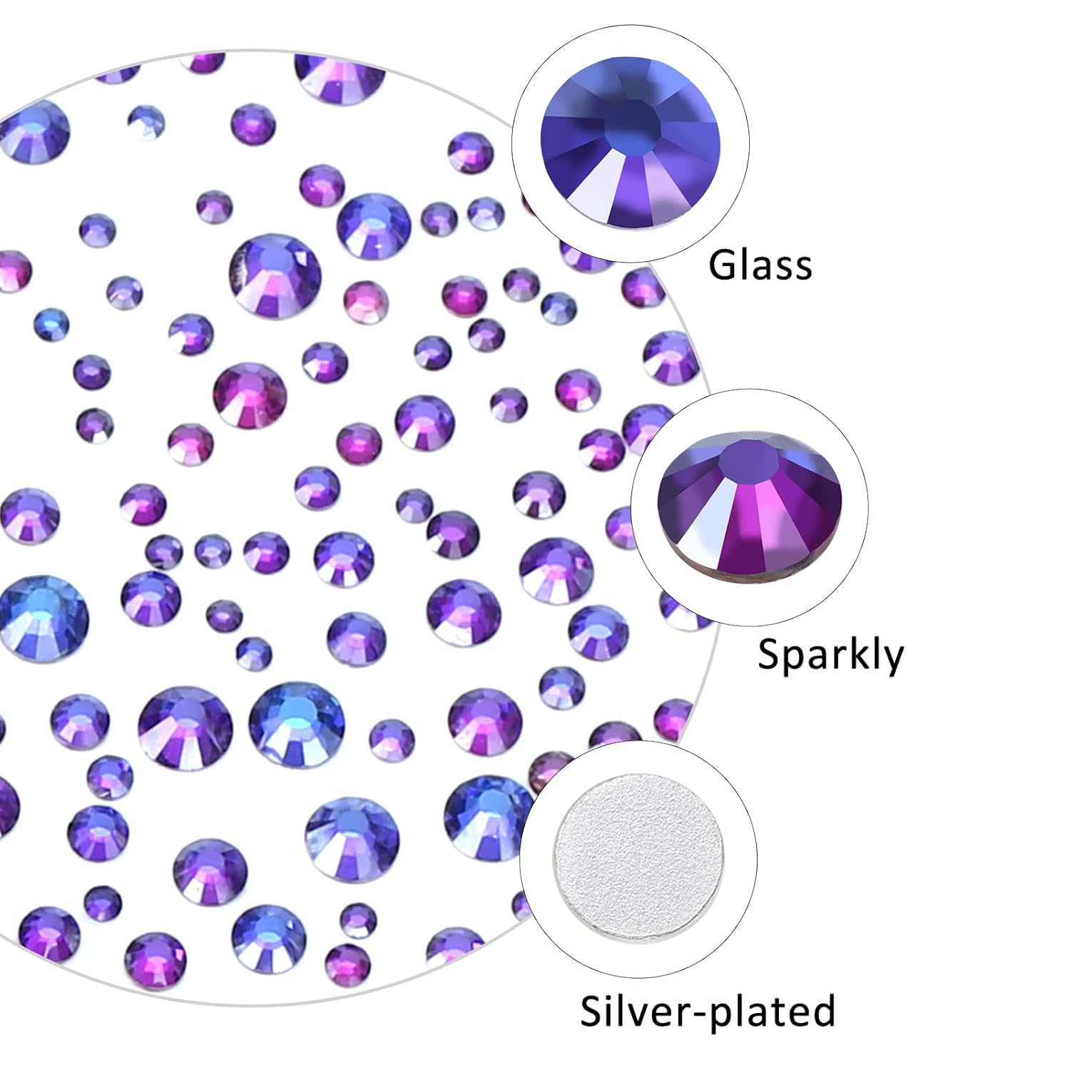 - 💎Material: glass/artificial crystal. The surface has a high-precision section, multi-faceted cutting, high brightness and high gloss. Flat bottom, round shape, silver plated back, non-allergenic. The color runs through the rhinestones without fading.