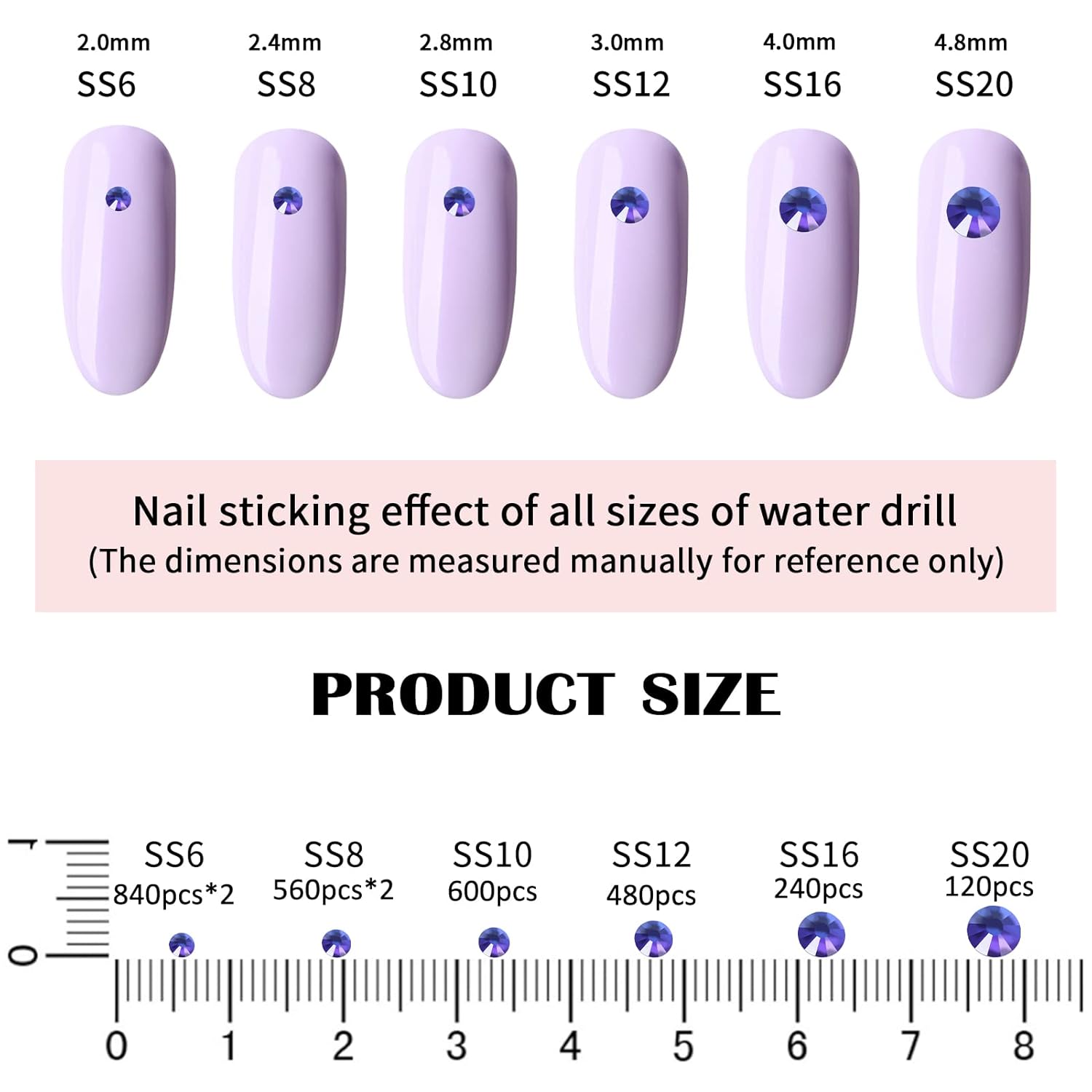 - 💎Product Packaging: Boxed SS6 2MM - 1680 Pcs, SS8 2.4MM - 1120 Pcs, SS10 2.8MM - 600 Pcs, SS12 3MM - 480 Pcs, SS16 4MM - 240 Pcs, SS20 4.8MM - 120 Pcs, 1 pcs Tweezers and 1 pcs picking pen.