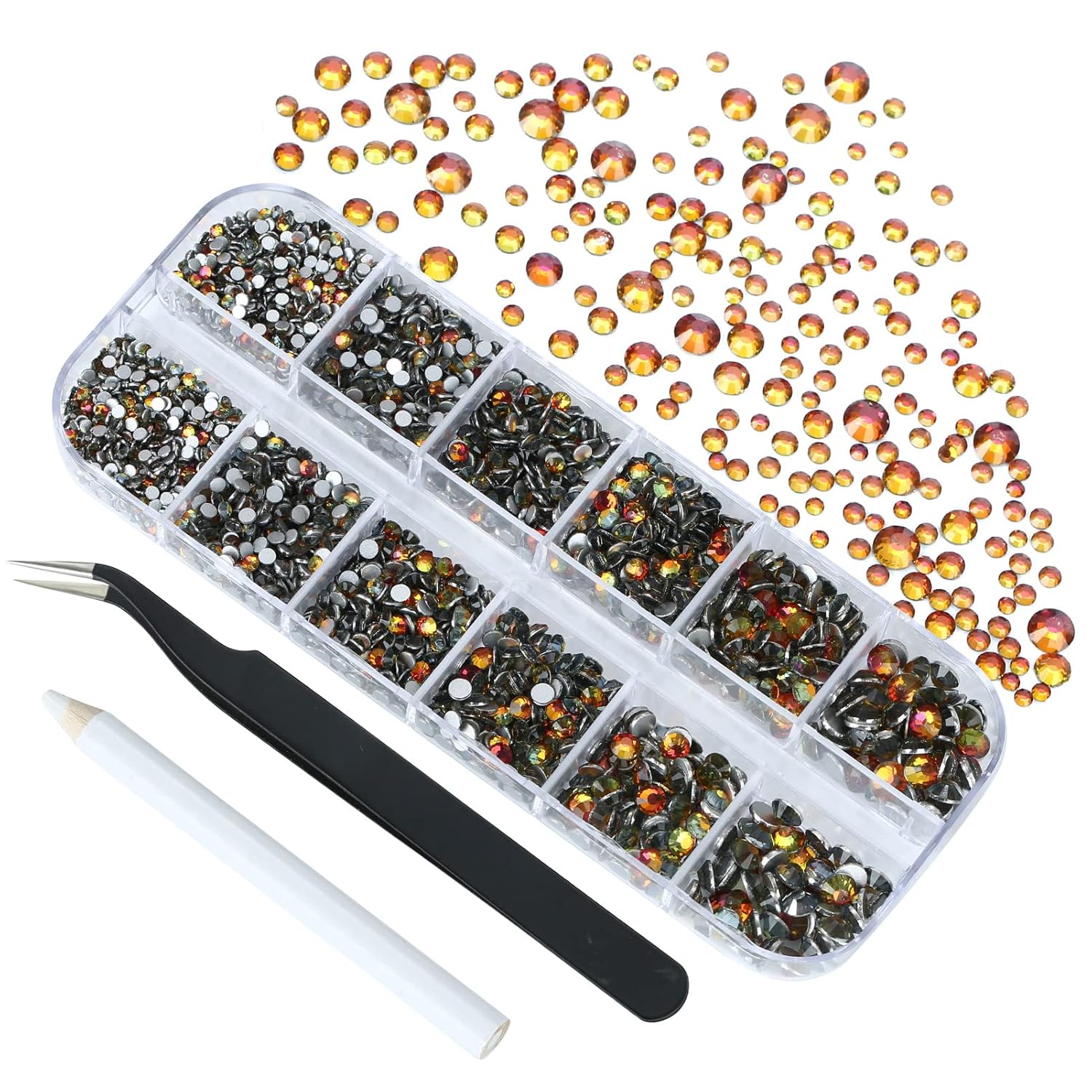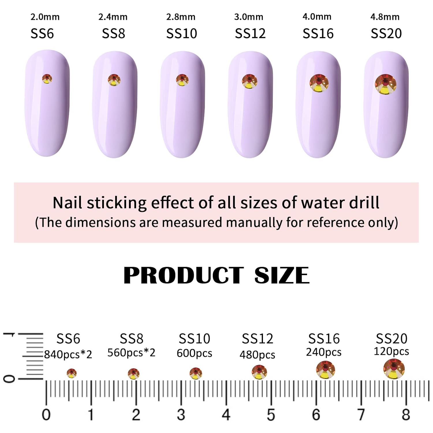 - 💎Product Packaging: Boxed SS6 2MM - 1680 Pcs, SS8 2.4MM - 1120 Pcs, SS10 2.8MM - 600 Pcs, SS12 3MM - 480 Pcs, SS16 4MM - 240 Pcs, SS20 4.8MM - 120 Pcs, 1 pcs Tweezers and 1 pcs picking pen.