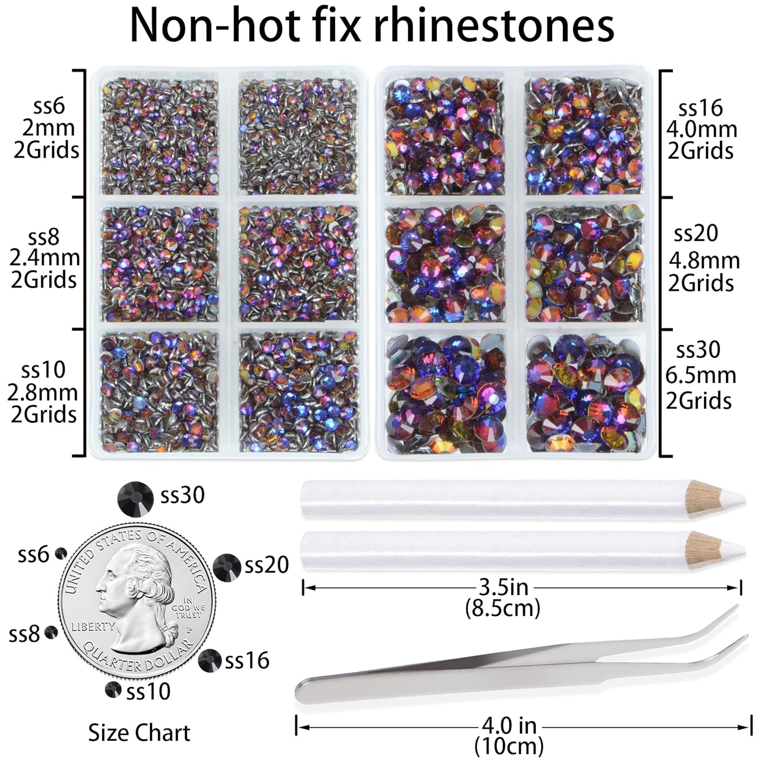 - 6 Sizes charming crystal rhinestones with storage boxes easy to carry, 1.5mm to 6mm. ss6 ss8 ss10 ss16 ss20 and ss30. Rhinestones are not hotfix and require glue to stick them, glue is not included.
