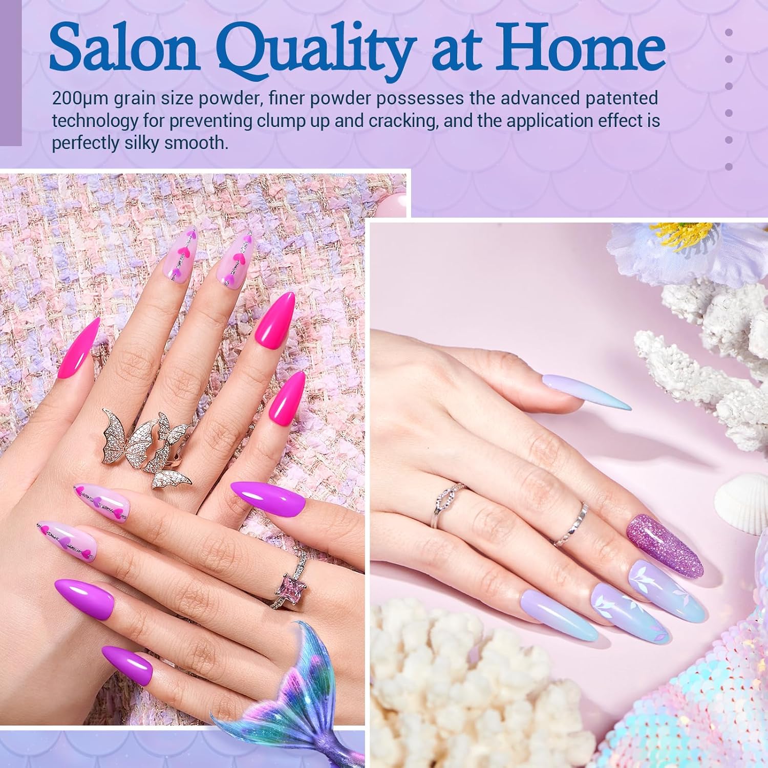 - đăLong Lasting Vibrant ShadesăThis anti-cracking nail dip powder kit starter set is on effortlessly & lasts more than 21+ days under daily use - no quick broken peeling off nails here! Most fashionable style colors, full but natural-looking, lightweight, breathable, waterproof. 32 popular and fashionable colors, more than 5000+ shades combos can be designed. Available in natural to bright shades, any luxury nail art is possible with our azure dip powder starter kit.