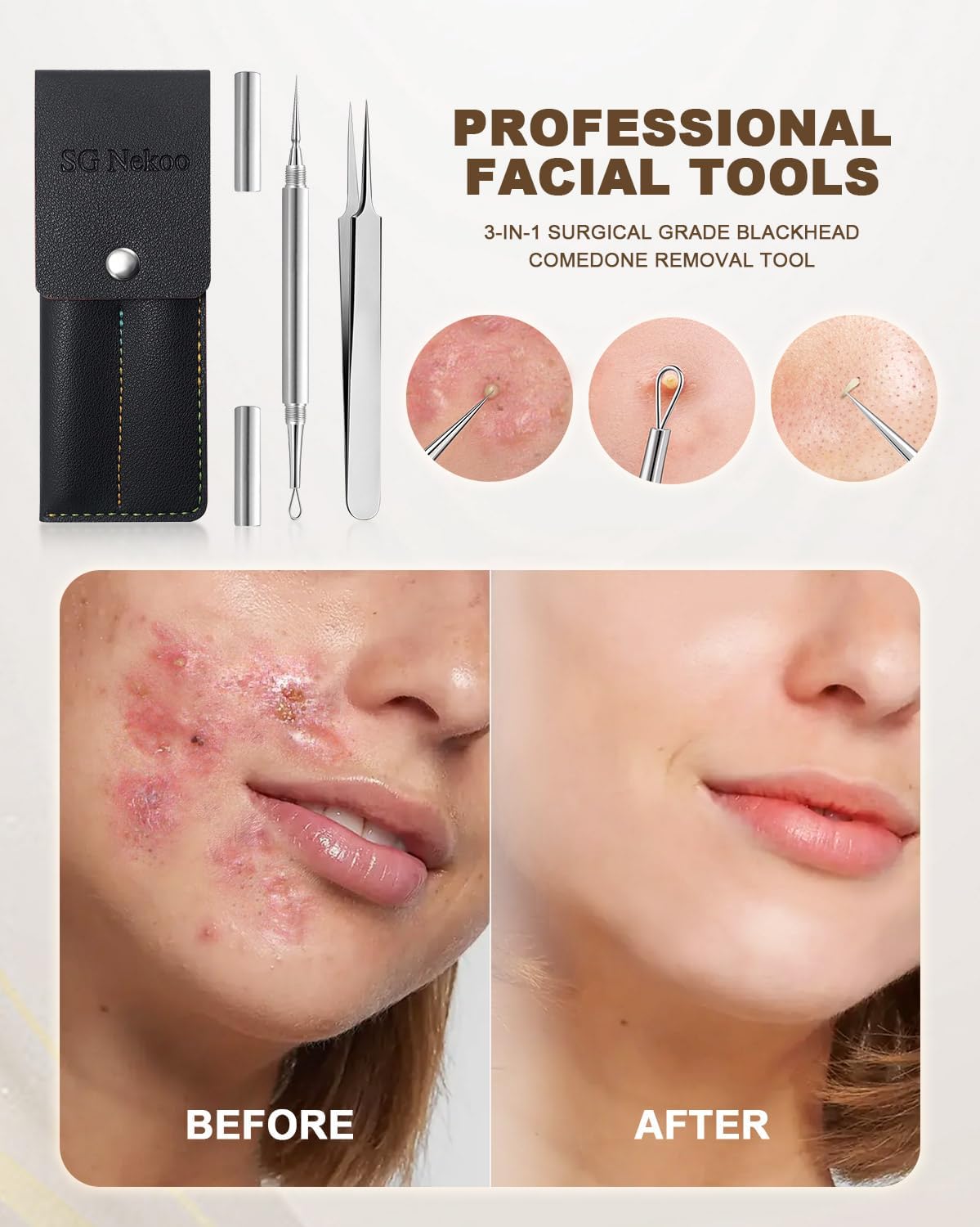 - TWO TOOLS IN ONE KIT: One is double end needle with circle loop & sharp tip, one is sharp tweezers; And comes with exquisite PU leather case; Great set for facial care; Made of high grade material, can be used for both normal skin or allergic skin, please wash with boiling water or alcohol before use;