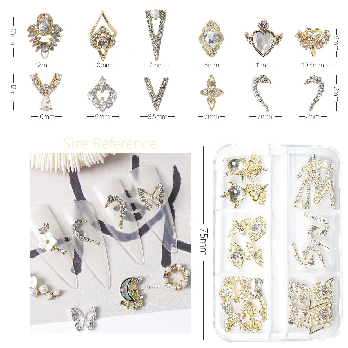 - â€ă24Pcs 12 Pair exquisite Luxury Nail charms, romatic valentines nail charmsăYou will get 24pcs shiny gold Luxury nail gems and rhinestones like heart nail art studs total in 12 different design, 1 pair every desgin, giving you different nail designs every time. Stored in a transparent white box, enough quantities meet your daily design needs, make your nail to be charming and bling.