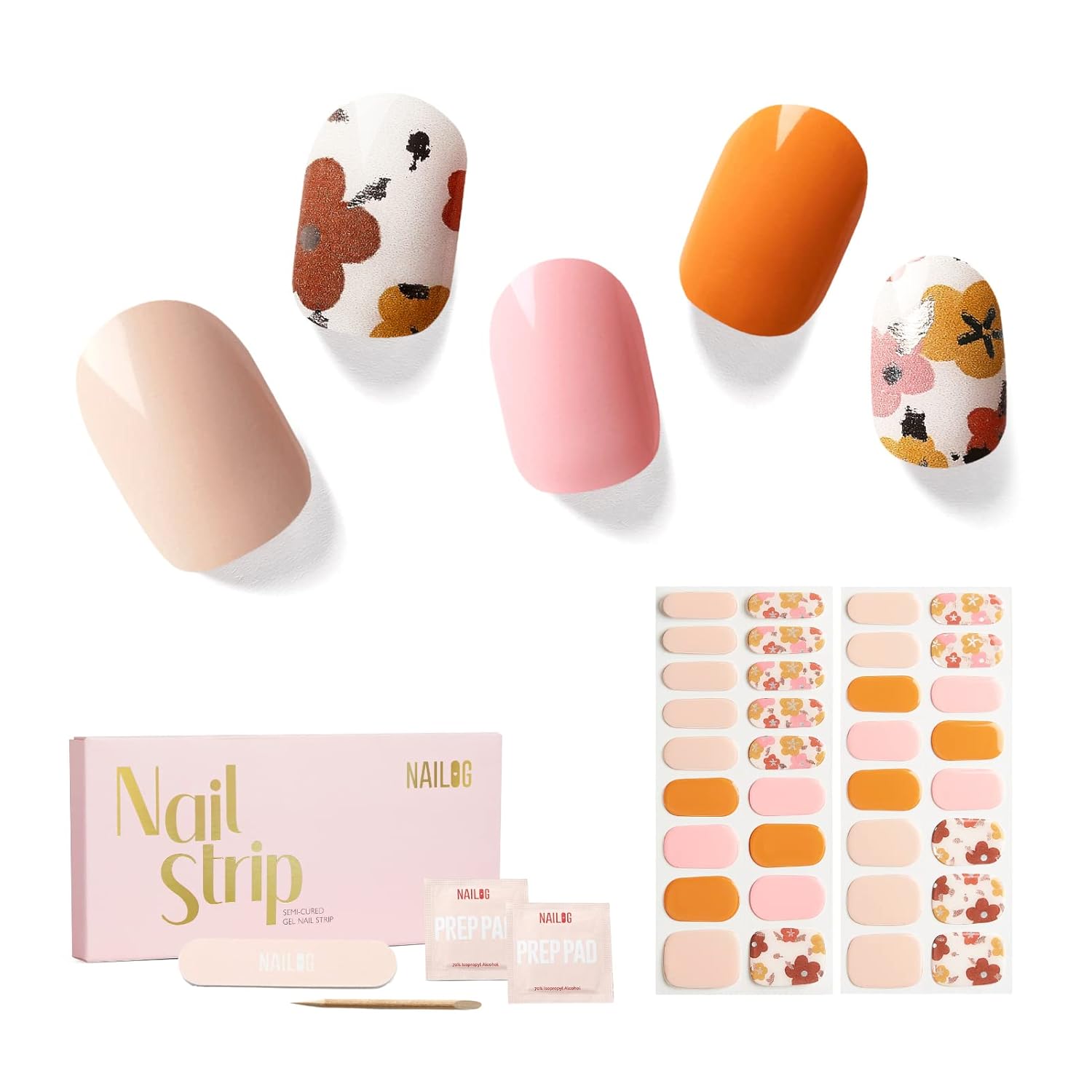 NAILOG Semi Cured Gel Nail Strips, 34 pcs Salon-Quality Stickers, Long Lasting Wraps with Soft Gel Finish | Waltz of The Flowers