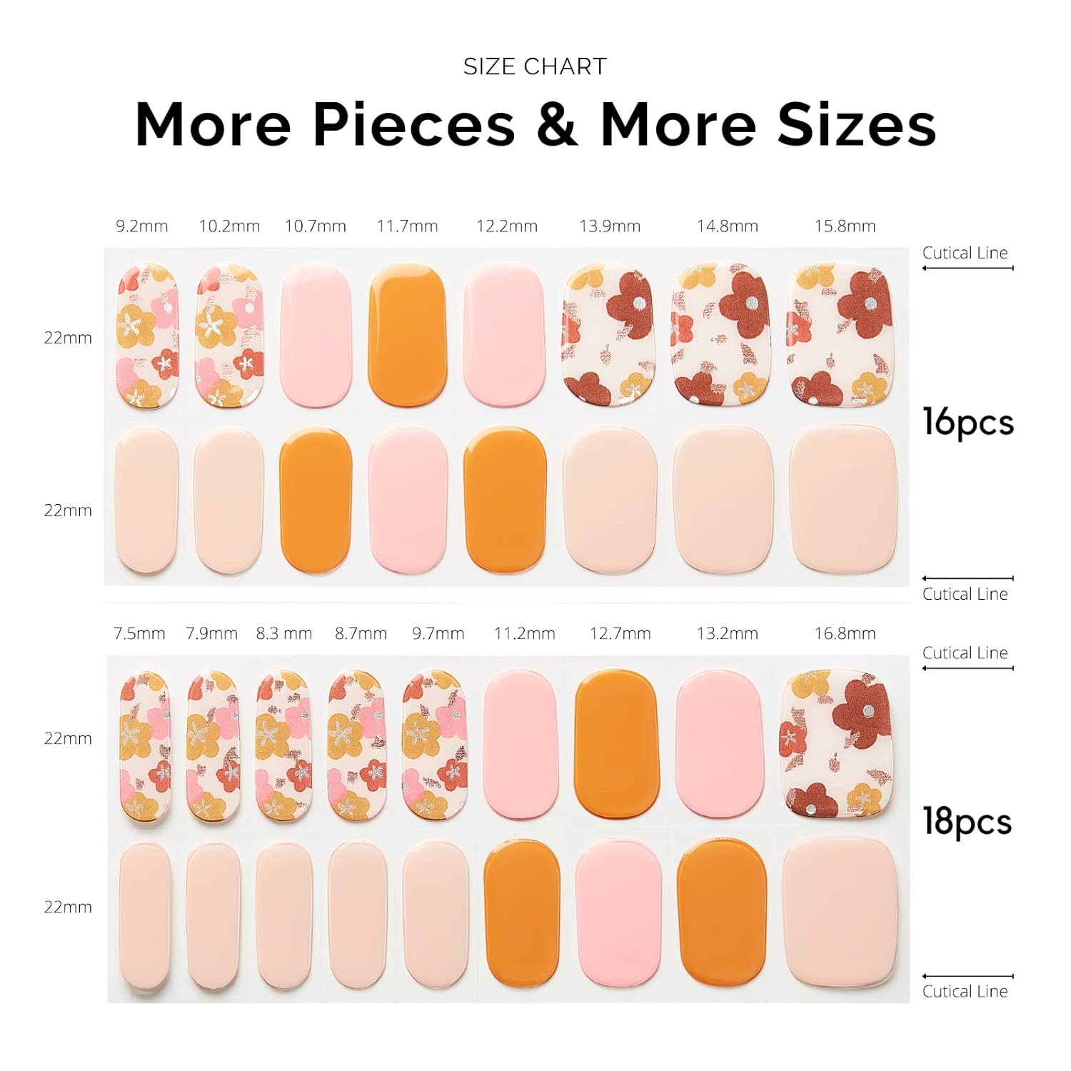 - 34 PCS NAIL STRIPS: More Quantity & Sizes than Ever! With 17 different sizes of our nail art stickers, you can easily find the right size to match your nails. New curved side line fits even better with your nail shape for seamless adhesion.