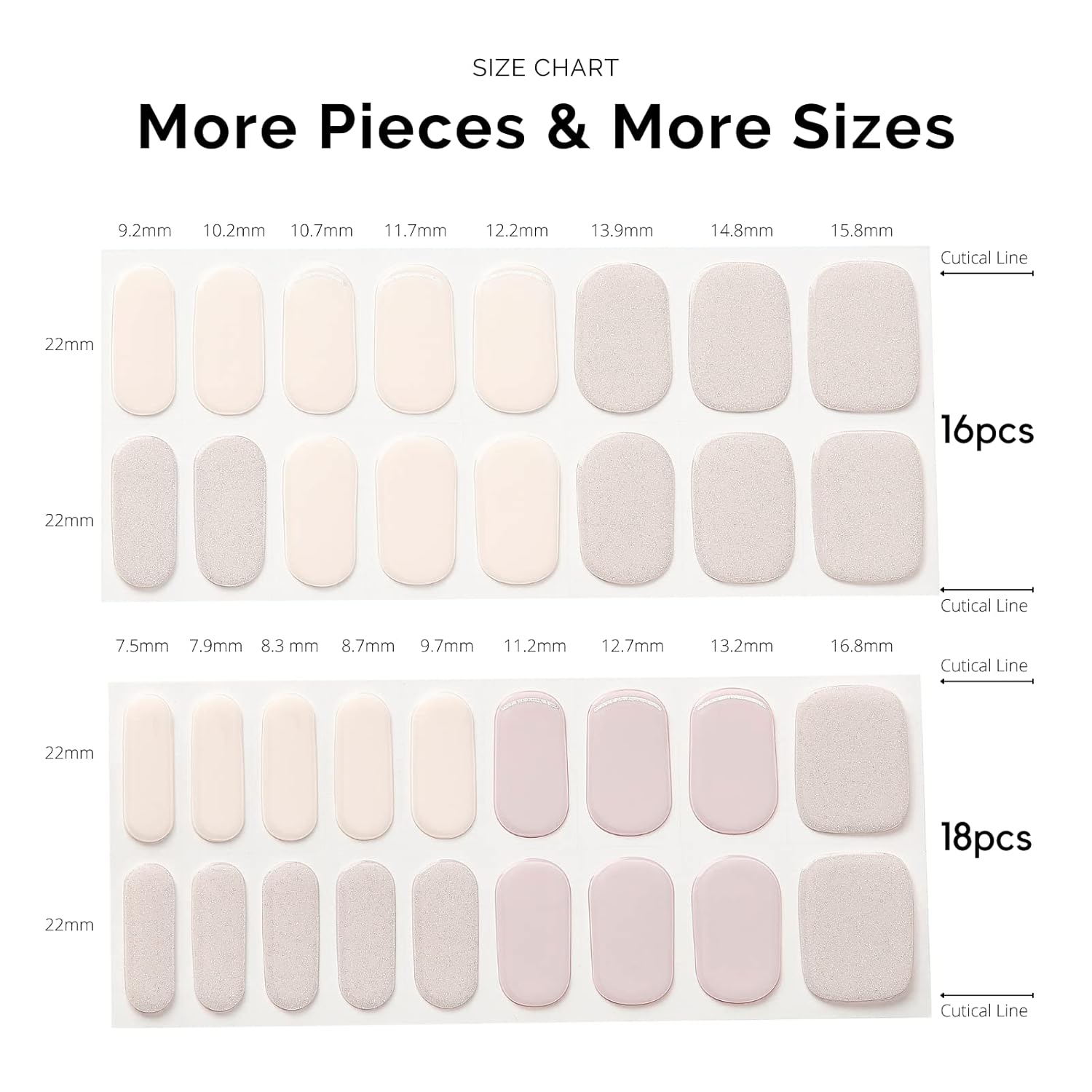 - ăWHAT YOU GETă34 Pieces gel polish strips in 17 sizes, 2 prep pads, 1 nail file, and 1 wooden stick. -Our semi cured nail strips are free from toxic, animal-derived, or harmful ingredients and are vegan, safe to use, and odorless. A perfect cost & time-saving DIY manicure kit.