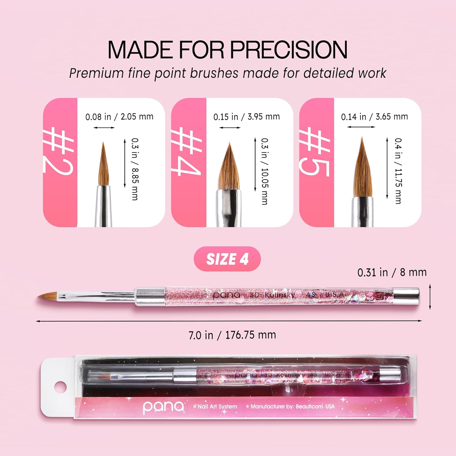 - PANA 3D Sculpture Nail Art Brush has a delicate and soft 100% kolinsky hair bristles it looks stylish while working with a unique style of brush glitter acrylic handle with a silver ferrule and a high-quality brush size #4. The premium quality silver ferrule securely locks the pen body and tip firmly, making the brush sturdy and durable for long-term use.