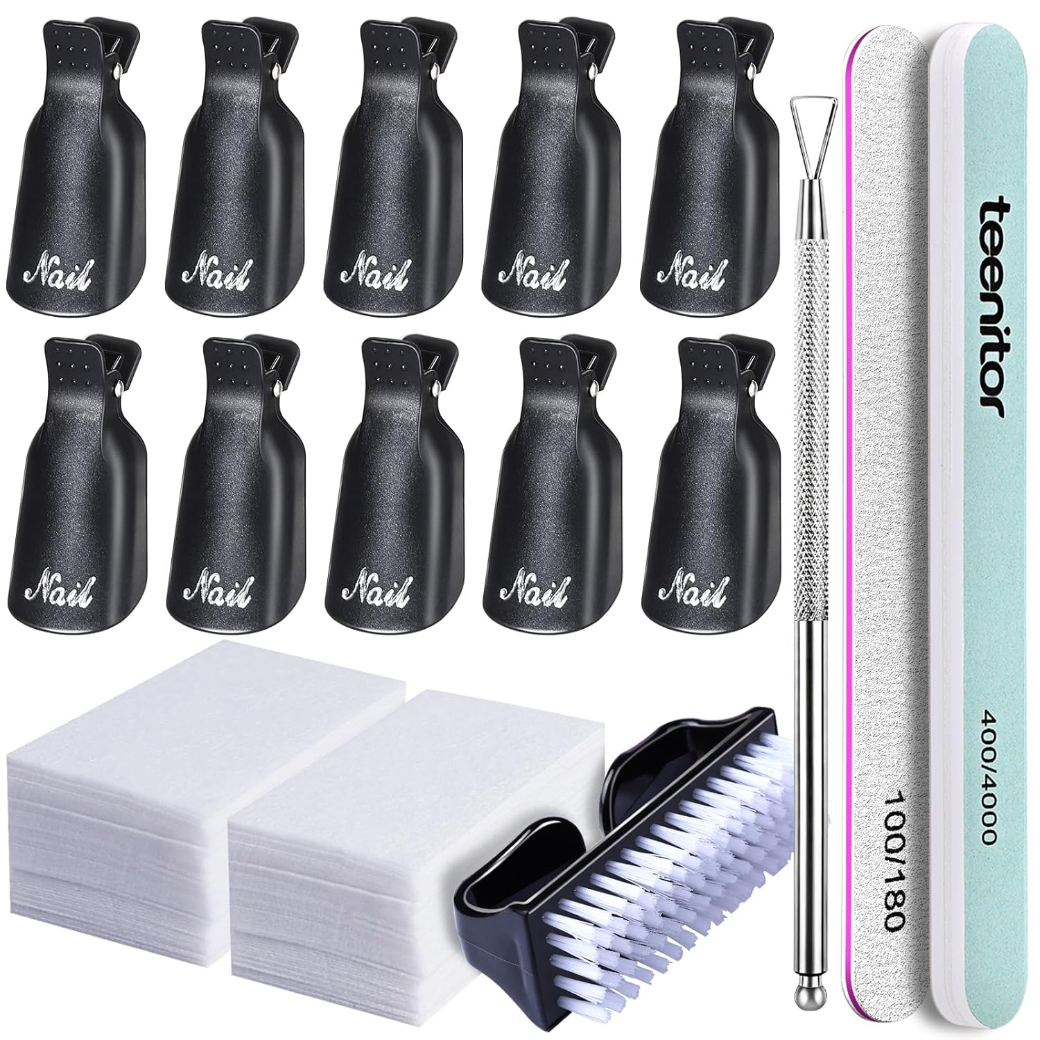 Teenitor Nail Gel Remover Tools Kit with Nail Remover Clips, Nail Remover Pads, Nail Brushes, Nail File Buffer, Cuticle Peeler Black