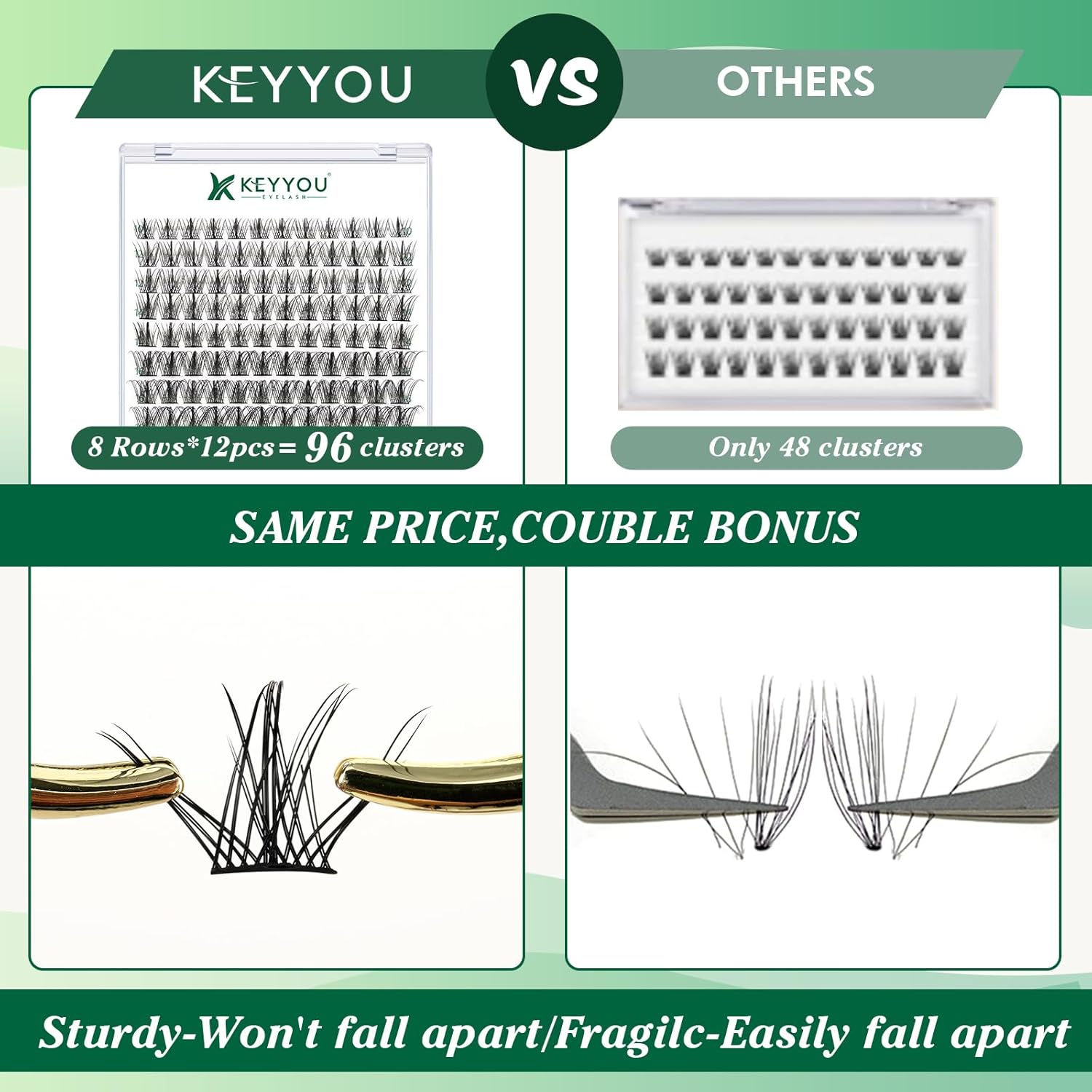 - 【Soft&Comfortable】KEYYOU lash cluster are made of imported materials,the stem line is thinner and softer, the eyelash cluster are lighter and more comfortable to wear.96 clusters in one tray ,more cost-effective.