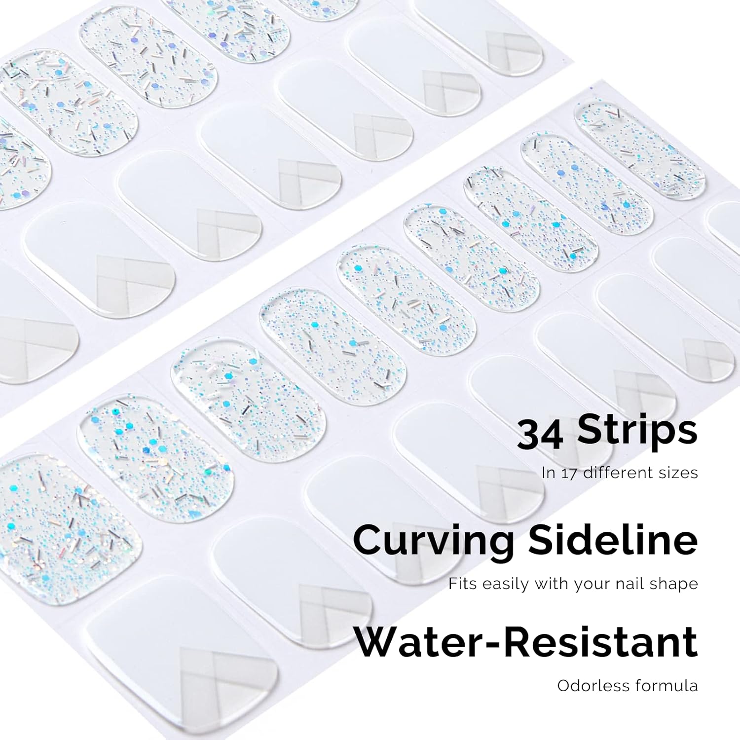 - ăWHAT YOU GETă34 Pieces gel polish strips in 17 sizes, 2 prep pads, 1 nail file, and 1 wooden stick. -Our semi cured nail strips are free from toxic, animal-derived, or harmful ingredients and are vegan, safe to use, and odorless. A perfect cost & time-saving DIY manicure kit.