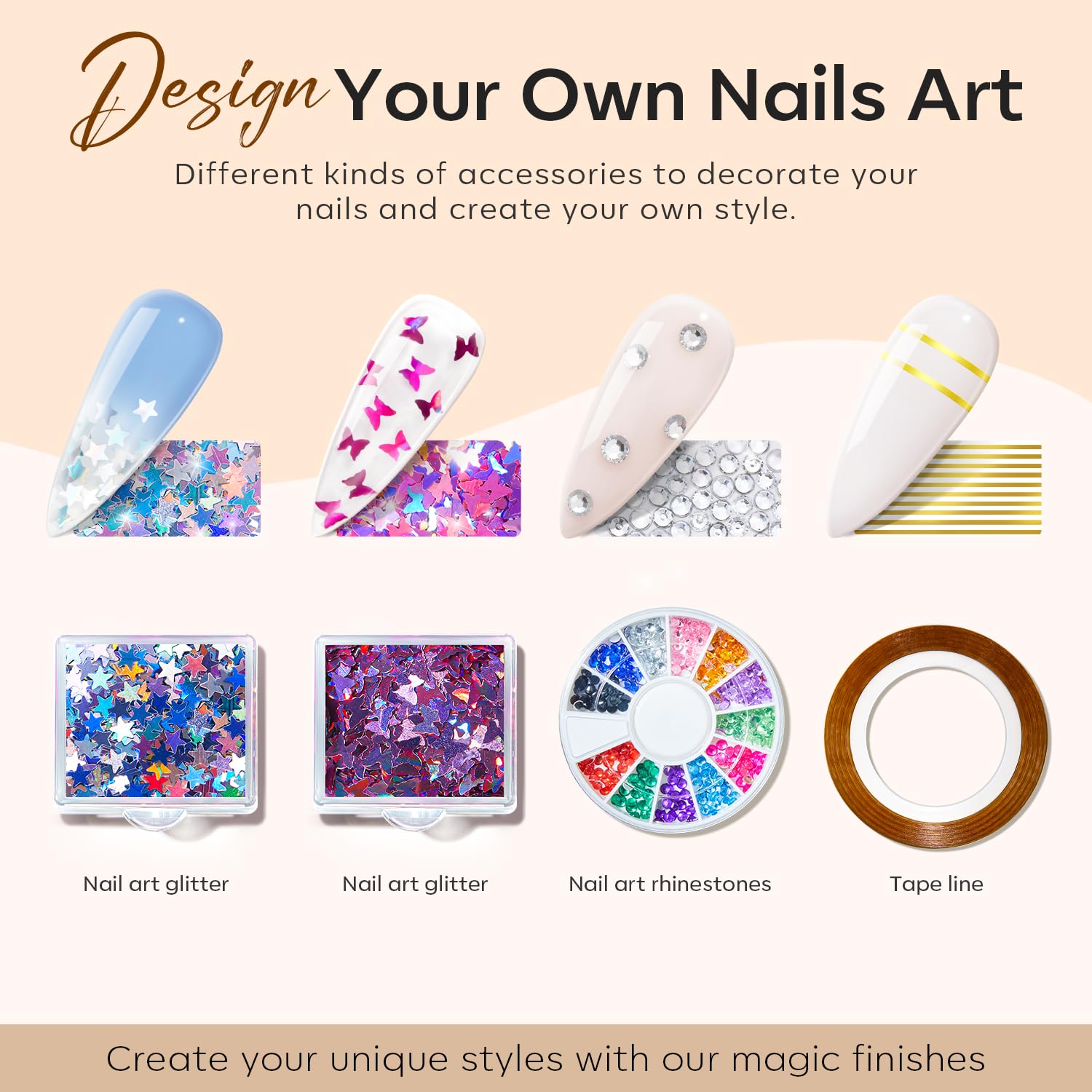 - 【Beginner-Friendly】: Our poly nail gel starter kit provides an easy way to help you master the techinique and do your own DIY nails at home. 32 different colors, from nude to bright, dark to glitter colors, cover all seasons daily poly mani need, plus a variety of glitters & rhinestone gives you endless nail art creative possibilities. The poly nail kit also comes with all basic manicure tools like nail tips ,nail forms help you create any extension nails sizes and shapes you like