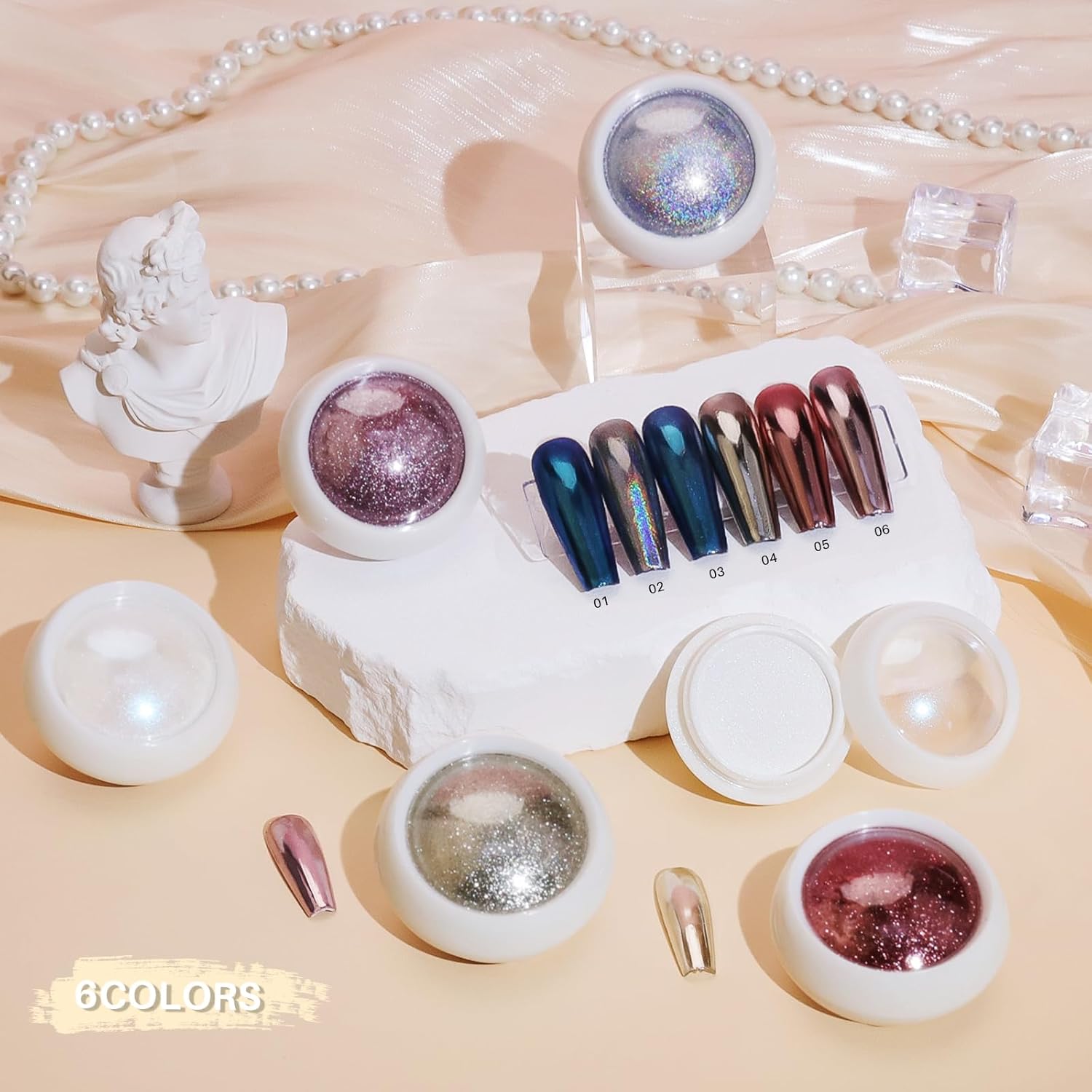- đăQuality MaterialăMermaid Chrome Nail Powder is made of synthetic resin, safe and non-toxic. The glossiness is very translucent and you can feel its delicacy. The nail powder pigment has a great chrome, holographic and pearlescent effect.