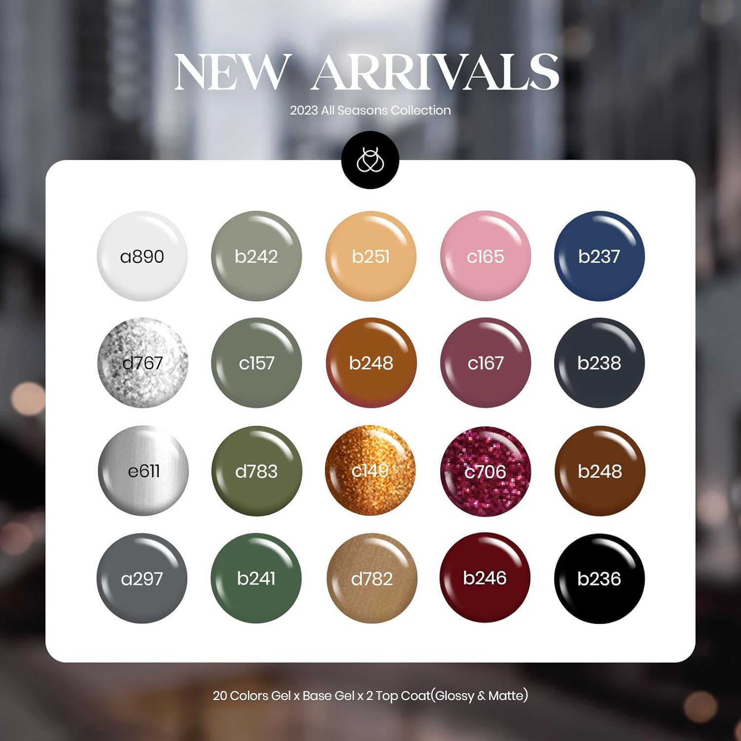 - 【What You Get】: 20 x Mini Gel Polish Colors (5ml each bottle) + 3 x No Wipe Base and Glossy & Matte Top Coat (7.5ml each bottle). 20 beautiful shades of popular and trendy colors suitable for all seasons and daily routine life! This Nude Pink Gray Red Gold Green Brown Blue Glitter Gel Polish Kit is an ESSENTIAL for everyone! A good choice for a gift.