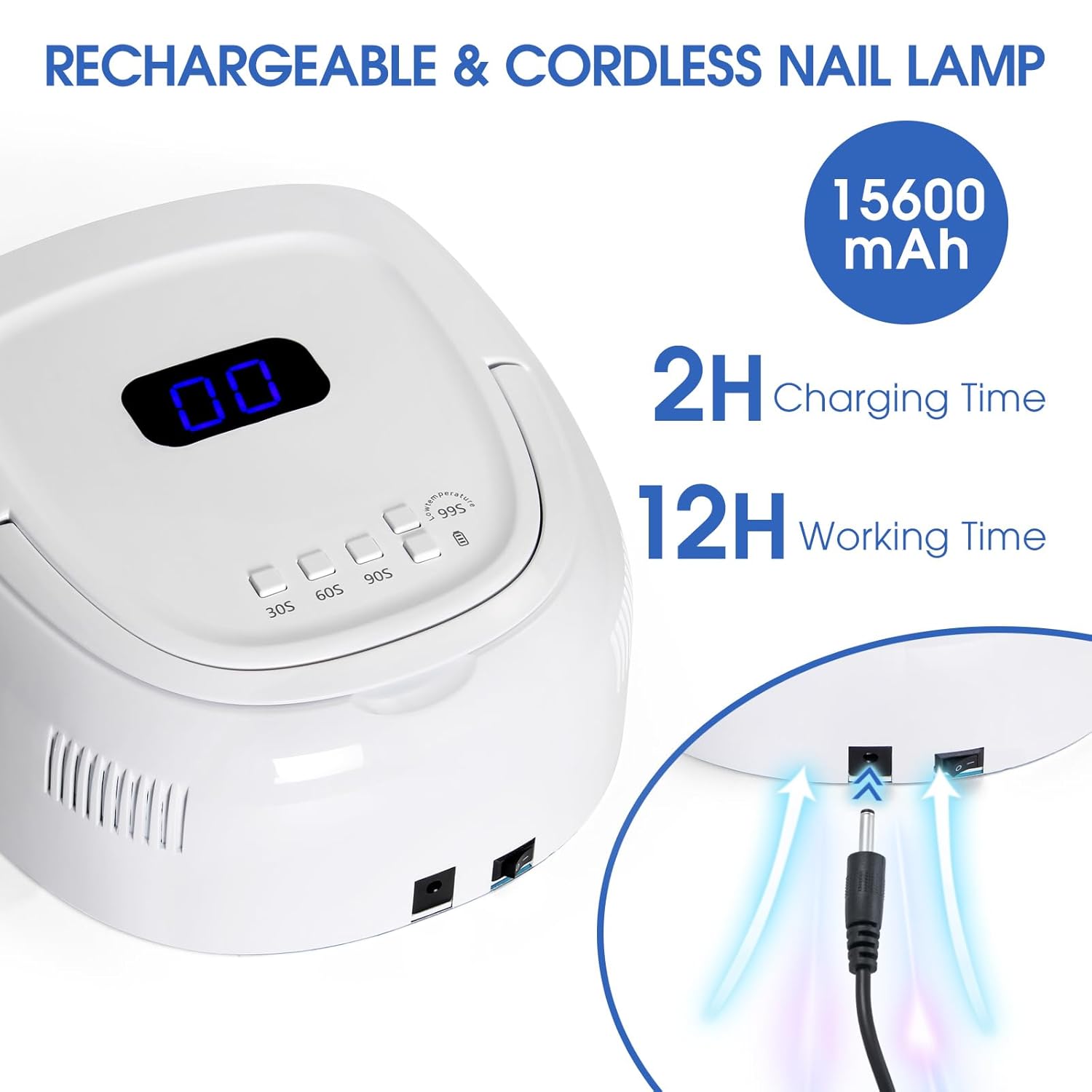 - Gel UV Light for Nails: This uv light for gel nails built-in rechargeable battery 15600mAH battery, 12 hours continues working time after 2 hours full charging. Lift Handle design make the nail dryer easy to carry