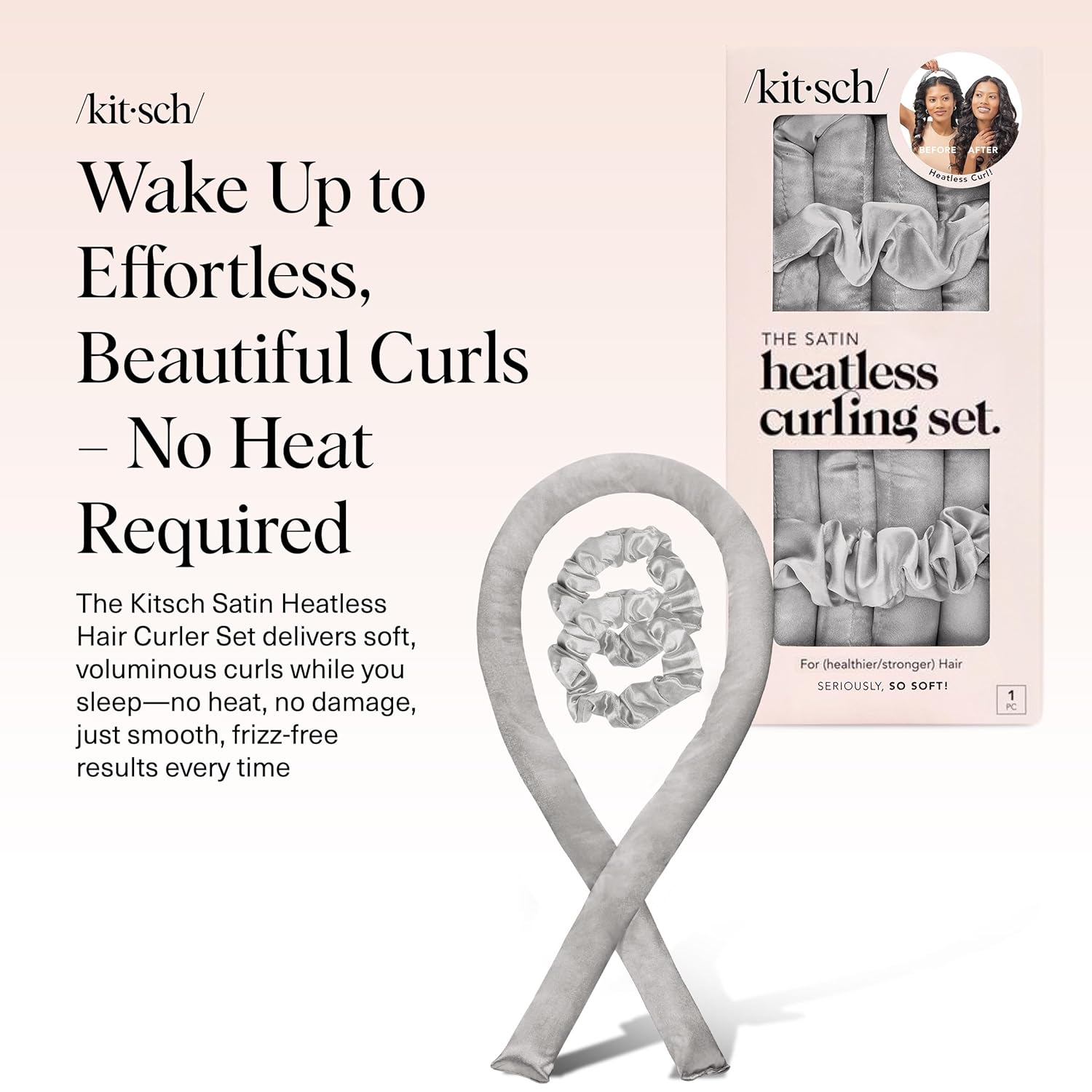 Kitsch Satin Heatless Curling Set – Heatless Hair Curler for Women, Hair Curler to Sleep In - with 2 Satin Scrunchies for Overnight Curls – No Heat Damage Styling with Heatless Curler - Silver