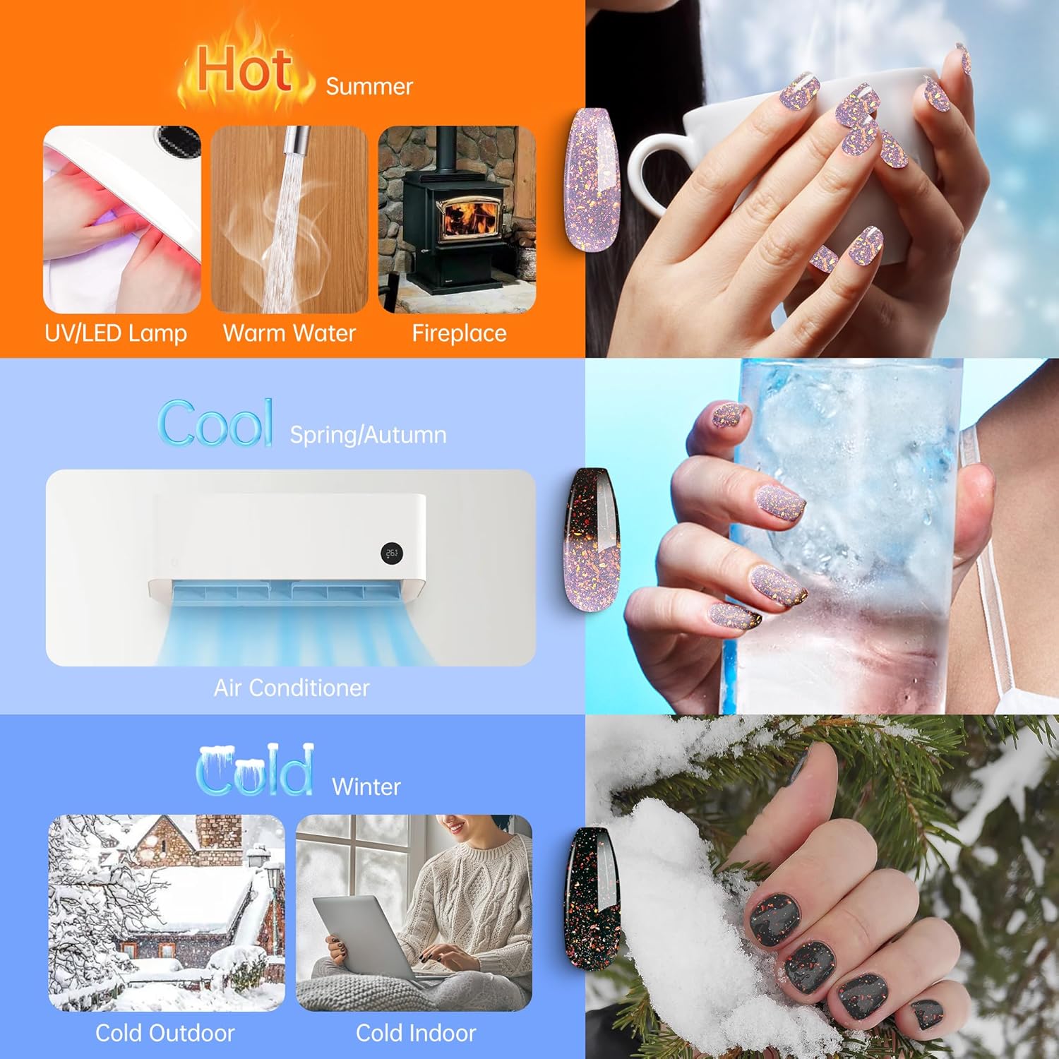 - Color-changing Brocade Glitter Gel :The gel changes color when the temperature exceeds 31°C or falls below 22°C, darkening as it cools and lightening as it warms. The colorful glittery brocade glitter in the gel creates a dazzling and radiant nail look.