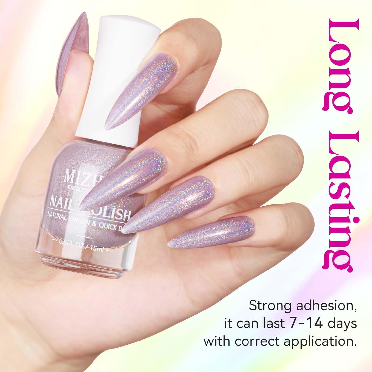 MIZHSE Holographic Nail Polish, Light Purple Glitter Nail Polish Air Dry Fast, 15ml/0.5 fl oz High Glossy Shimmer Nail Pigment Laser Oil-based Nail Lacquer Chrome Halo Nail Art Salon Manicure at Home