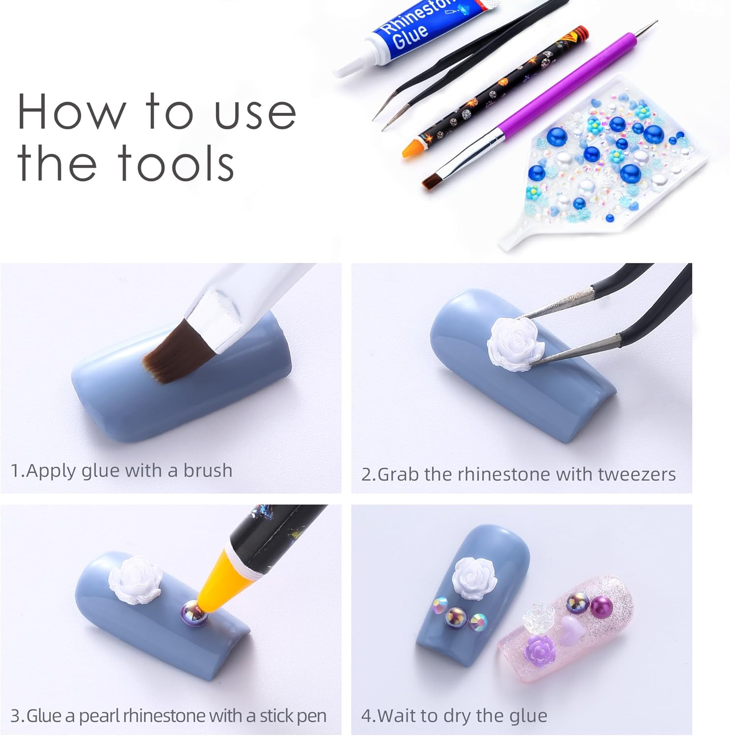 - Useful tools - These pearls and rhinestones have a flat back, which is excellent for easy placement.and you can pick up any large or small pearls and rhinestones with the crayons we bring along. And use the brush to smooth out the Gel, these tools will work very well